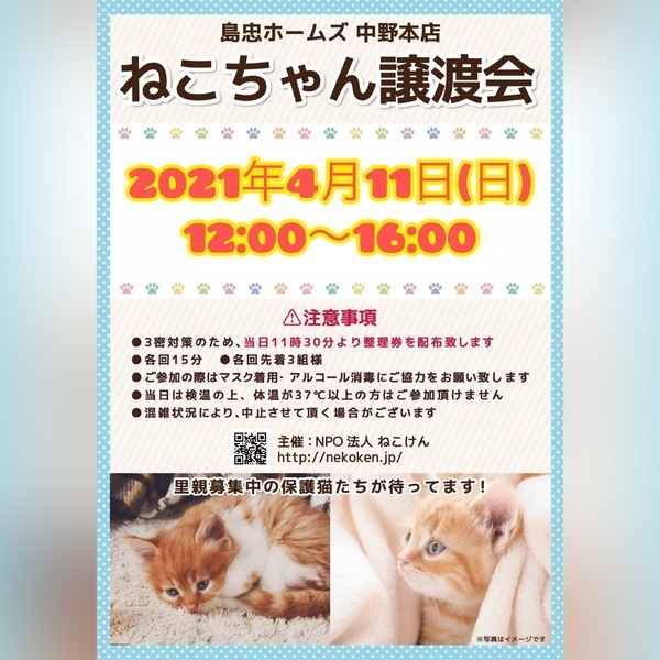 | イベント内容 | ペットとしてではなく、生涯家族として猫を迎えて下さる方への譲渡となります。 原則『譲渡会』もしくは『完全予約制個別お見合い』にて正式なお申込みを承っております。 譲渡会には家族を待っている猫さん達がたくさん参加します♪ ▽▲ねこけん定期譲渡会▲▽ ★毎月第2日曜日は島忠ホームズ中野本店にて開催♪ [時間] 12:00〜16:00 [会場] 島忠ホームズ中野本店 〒164-0014 東京都中野区南台5-24-13 https://www.shimachu.co.jp/shop/tokyo/310.html (注)中野店ではなく中野本店での開催です。 [交通] ・東京メトロ丸ノ内線 方南町駅 徒歩約8分 ・大型駐車場完備 (注)方南通り、環七方面よりお車でお越しの際は 弥生町六丁目交差点は右折できません。 手前の信号で右折して下さい。 ※当日11:30より整理券を配布します。 (各回15分、各回先着3組様) ※屋内での開催となり雨天決行です。 ※猫ちゃんたちとのふれあいはできません。 ※事前のご予約は必要ございません。ご家族皆様でお越し下さい。 ▶▶毎月第4日曜日は島忠ホームズ仙川店にて開催♪ ◆必ずお守り頂く事◆ ①終生飼養 ②完全室内飼養 ③年1回のご報告 ④ペット飼育可能な物件にお住まいであること ただし、以下の該当の方は、譲渡出来ない場合がございます。 ※学生、安定的な収入のない方 ※60歳以上の方は、成猫さんを家族に迎え入れることが出来ます。 里親様のご年齢に応じた成猫の譲渡となりますのでご相談ください。 ◆譲渡費用について◆ 不妊去勢手術・医療費の一部負担をお願いしております。 お届けエリアによっては往復高速料金(実費)を別途ご負担いただく場合がございます。 なお、交通費に関しましては正式譲渡に至らない場合であってもご返却できませんので予めご了承下さい。 ・ご希望の猫さんと家族になるまでの流れ ・譲渡時にかかる一部ご負担金などの詳細 ・譲渡契約書のサンプル等 下記URLに掲載しておりますのでご確認ください。 https://nekoken.jp/jotokai/joto-nagare/ https://nekoken.jp/jotokai/joutokibou/ ◆引き渡し方法◆ 1週間程度のトライアルの後、正式譲渡となります。 必ずご自宅までお届けします。 ◆お届け可能エリアについて◆ 応募可能エリア内であっても、遠方の場合アフターフォローの関係上お断りさせていただくことがございます。 ご心配な際は、前もって市区町村名や最寄り駅等をメールにてお問い合わせいただけますと幸いです。 お手数をおかけいたしますが、何卒ご了承くださいますようお願いいします。 ※譲渡会日程がご予定と合わず個別お見合いご希望の方は、各募集サイトからのご応募 もしくは下記連絡先までお問い合わせください。 [連絡先] ご質問等ございましたらお気軽にお問い合わせください。 NPO法人ねこけん東京本部 https://nekoken.jp/inquiry/ nekoken@cat.email.ne.jp [ホームページ] https://nekoken.jp [Instagram] https://www.instagram.com/nekoken2222/ [ブログ・ボラ日記・YouTubeなど] https://linktr.ee/nekoken フォロー・チャンネル登録よろしくお願いします! |