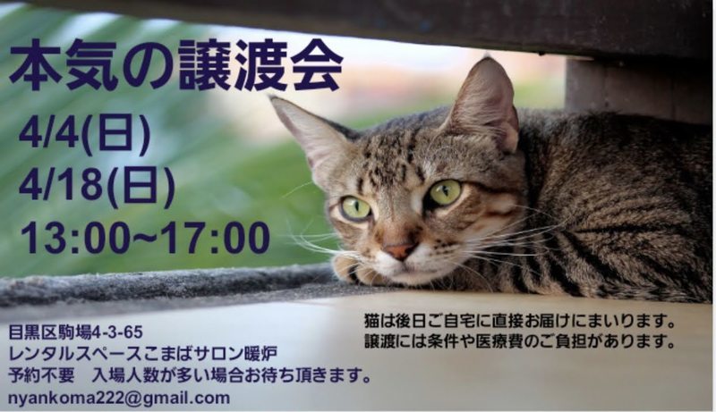 | イベント内容 | 主に個人猫ボランティアさんたちが多く参加する猫の譲渡会です♪ [主催] 保護猫譲渡会カフェ こまばサロン暖炉 [FBページ] https://www.facebook.com/nyankomaba [FBイベント] https://www.facebook.com/nyankomaba/events ※必ず上記URLの主催者様のページをご確認ください。 -------------------- 2021/4/18(日) 13:00~17:00 東京都目黒区駒場4-3-65 こまばサロン暖炉 にて保護猫譲渡会を開催します。 ※予約優先制となりました。 60分毎入れ替え制 各回16名まで限定 早くにいらっしゃっても時間前には入れません。 60分で猫ちゃんを選んで、お申し込みの方はお申し込みのお部屋へ移動してください。 お申し込みのない場合はそのままご退出ください。 ご予約は nyankoma222@gmail.com に、 以下の点を添えてお申し出ください。 ・名前(ニックネーム可) ・希望時間帯(①13:00~②14:00~③15:00~④16:00~) ・人数(なるべく2~3名に抑えて下さい) ・会いたい猫がいれば猫の名前 トラブル防止のため、電話ではなくメールでのご予約をお願いします。 現時点での予約状況はFacebookのイベントページで順次更新されますのでご確認ください。 様々な理由で保護された猫達の里親さんを探す譲渡会です。 個人ボランティアが多く参加しますので、 保護主によって応募条件や譲渡費用が異なります。 新型コロナウイルス感染対策としては、開催前は次亜塩素酸水と高温スチームモップによる床などの除菌・清掃を行います。 開催中は定期的な換気を行い、手指の消毒スプレーなど複数設置します。 会場へはマスクの装着必須です。 入り口で検温と消毒をします。 当日咳および発熱の症状のある方はご来場をご遠慮ください。 だっこやお触りなどのふれあいも出来ません。 猫が見たいだけ、飼いたいけどペット不可住宅に住んでいる、3年後に飼うつもり、家族が反対しているなど、すぐに猫を飼えない方のご参加はご遠慮下さい。 本気で猫を飼いたい方に参加して頂きたい譲渡会です。 飼いたいけれど今回はビビっと来なかったという方に無理矢理猫を勧めたりはしないのでご安心ください。 当日の猫のお渡しは出来ません。 カンパや寄付などは玄関前でのお引き取りになります。 |