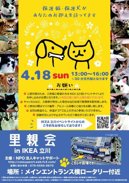 | イベント内容 | << IKEA立川 猫ちゃん・ワンちゃん譲渡会 >> 4月18日 (日)13:00 ~16:00で保護猫・犬の譲渡会を実施しています!! 猫ちゃん・ワンちゃんを家族に迎えたいと思っているお客様に出会いのチャンスです。 日程:4月18日 (日) 時間:13:00 ~16:00 場所:入口横ロータリー ・今回の譲渡会はコロナウイルス感染予防から応募制にしております。 予約ページ: https://www.ikea.com/jp/ja/stores/events/book/15736 ・欠員等が出た場合、当日会場では整理券を配布いたします。 ※悪天候/動物の体調状況により、時間変更・中止の場合あり ※安全と衛生上の理由につき、イケアストアへのペットのご入館はご遠慮させていただいております。 ※猫ちゃん・ワンちゃんの体調・天候により時間変更・中止にある場合が御座います。 ※当日に猫ちゃん・ワンちゃんをお渡しする事は出来ません。譲渡には条件があり、詳細は当日会場にてご相談ください。 |