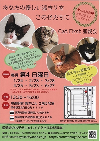 | イベント内容 | 大阪のコロナウィルス感染者数が急増の為 4月の里親会は中止となりました。 楽しみにされていた方には申し訳ありません。 来月、お会いできる事を願っております。 お問合せ先 catfirstsatooyakai@yahoo.co.jp ブ ロ グ http://catfirst.blog.fc2.com |
