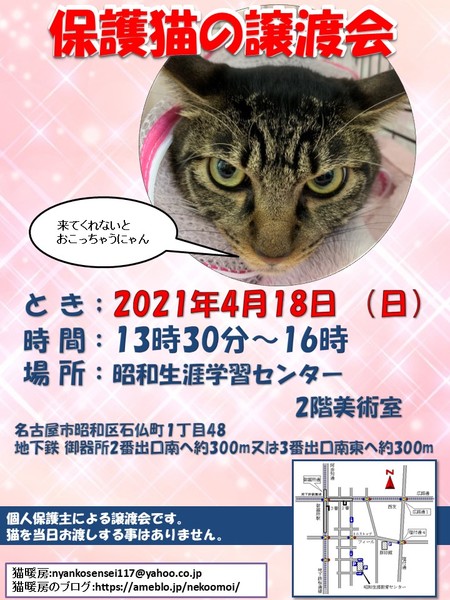 | イベント内容 | 保護猫の譲渡会! 名古屋市昭和区 昭和生涯学習センター2階 美術室にて開催します。 少し育った若猫、性格が安定した大人猫が ずっとのおうちを探しています。 個人保護主が集まって共同開催しております。 譲渡条件などは 個々の保護主よりますので 気になる猫さんがいましたら お気軽に保護主にお尋ね下さい。 (^-^) ご来場の際 マスクの着用をお願い致します。 マスクはご来場者様でご用意下さい。 希望者の方には アンケート記入をお願いしております。 アンケートを元に お話しをさせて頂きます。 当日 猫を連れて帰る事は出来ません。 お車でお越しの場合 施設駐車場 もしくは 近隣のコインパーキング(有料)をご利用下さい。 路上駐車は 近隣住民のご迷惑になりますのでおやめください。 譲渡会会場はお借りしているだけですので 会場へのお問合せはご遠慮下さい。 最寄駅 地下鉄 御器所駅 |