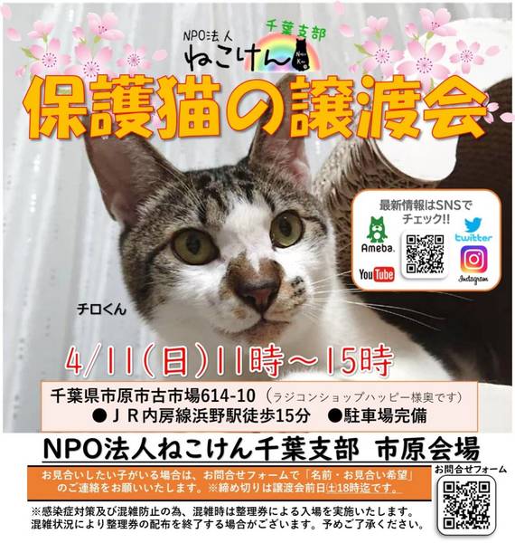 | イベント内容 | 今回は通常スタイルの譲渡会と致しますが、コロナウイルス対策として ・会場内ではマスクのご着用と入退室の際は消毒をお願い致します。 ・ご予約無しでお越しいただけますが、混雑時は整理券を配らせていただきます。 ご協力の程よろしくお願い致します。 成猫は指名制のお見合いとさせていただく子もおりますので、 『◯◯ちゃんと、お見合い希望』とご指名の事前申し込みをお願い致します。 ねこけん千葉支部のブログ内にありますお問い合わせフォームより、 ⚫︎お名前 ⚫︎ご住所(市区町村までで大丈夫です) ⚫︎お見合いご指名猫の名前を、お知らせください。 ※締め切りは譲渡会前日4月10日(土)18時までとなっております。 ねこけん千葉支部ブログ→ https://ameblo.jp/nekoken-chiba/ また、譲渡会会場では、千葉県内にお住いの預かりボランティアさん及びお世話ボランティアさんを募集しています。 ご希望の方は、大変お手数をおかけしますが、譲渡会までお越しください。 ※ご都合がつかない場合は、お問い合わせ先までご相談ください。 [日時] 4月11(日)11:00~15:00 [会場] 千葉県市原市古市場614-10 ※屋内での開催となり雨天決行です。 ※抱っこもOK! ※猫ちゃんの負担も考え、ご来場は時間内にお願い致します。 ※特にご予約などは必要ございませんのでご家族皆様でぜひお越し下さい。 ※駐車場あり。 [交通] 交通機関を利用してお越しの方 JR内房線 浜野駅より徒歩13分 浜野駅は、東京駅から京葉線→内房線でおよそ50分の距離!! お車でお越しの方 京葉道路蘇我インターより車で10分 ※駐車場はラジコンショップハッピー様裏手にございます駐車場をご利用ください [譲渡ご希望の方へのお願い] 誠に恐れ入りますが下記に当てはまります方への譲渡は不可となりますので予めご了承下さい。 ①学生さん、未成年の方、安定収入のない方 ②ペットを飼う事を許されていない住宅にお住まいの方 ③身体的、精神的疾病で治療中の方 ※60歳以上の方は別途条件がございますのでご相談下さい。 [譲渡の流れ] お申込み→審査→後日お届け→トライアル→正式譲渡 ※当日のお連れ帰りは出来ませんので予めご了承ください。 ※仮譲渡時にご希望の猫ちゃんにかかった医療費(血液検査・ワクチン・駆虫・不妊去勢手術等)をご負担願います。 しかし、正式譲渡に至らなかった場合は医療費を全額返済致します。 [主催] 動物愛護団体 NPO法人ねこけん 千葉支部 [ブログ] https://ameblo.jp/nekoken-chiba/ [参加動物] 成猫・子猫(ねこけん保護猫以外の猫ちゃんも参加予定です) [お問い合わせ] ご不明な点、ご質問等ございましたら下記までお問い合わせください。 chiba.info@nekoken.jp ※譲渡会へお越しの際、特に予約等必要ありません。 |