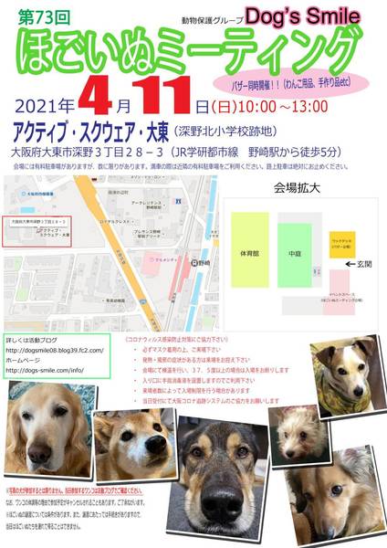 | イベント内容 | 4月11日(日)大阪府大東市の「アクティブ・スクエア・大東」で、第73回ほごいぬミーティングを開催します。 保護犬を家族に迎えようと考えている方、保護犬に会ってみたい方、保護犬について知りたい方、ぜひご来場ください。 当日は、Dog's smileグッズやワンコ用品の販売、Dog's smileを応援してくださる方々が手作りされた手作り雑貨などの販売も行います。どれもお買い得です。 売り上げは、私たちの活動資金になります。ぜひご協力をお願いします。 なお、来場予定のワンコについては、活動ブログをご確認ください。 来場者のみなさまには、コロナウイルス感染拡大防止に御協力をお願いします。 ・必ずマスクを着用の上、御来場ください。 ・発熱・風邪の症状のある方の入場は御遠慮願います。 ・入口にて検温を行い、37.5℃以上の場合は、入場をお断りします。 ・来場者数により、入場制限を行う場合があります。 ・受付時に「大阪コロナ追跡システム」への御協力をお願いします。 日時 令和3年4月11日(日)午前10時~午後1時 場所 アクティブ・スクエア・大東 大阪府大東市深野3丁目28-3 (JR学研都市線野崎駅から西に徒歩5分) 会場には有料駐車場がありますが、数に限りがあります。満車の場合は、近隣のコインパーキングの利用をお願いします。 |