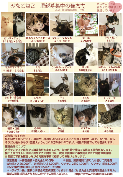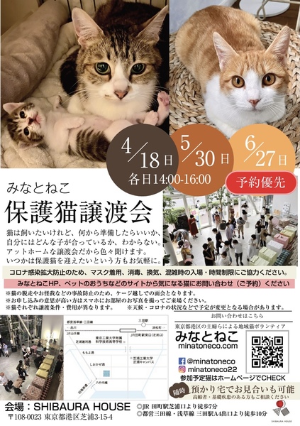 | イベント内容 | 東京都内を中心に年間180匹の譲渡を行なっている、みなとねこが田町駅芝浦口で譲渡会を開催します。 できれば預かり宅で普段の元気いっぱいな姿をみていただきたい。けれど、ご希望の方全員にお越しいただくのは難しい。 里親希望の方にしても一度見てから考えたい、わざわざお見合いに行ってしまうと断りづらいんじゃないかというお気持ちもあると思います。 そこで毎月譲渡会を行なってきました。 2020年7月からは地元港区内の開放的な素敵なレンタルスペースで開催しています。 緊急事態宣言下ではありますが、今回は少し規模を縮小して子猫と大人猫合わせて10ケージ くらい参加します。 みなとねこは今後もまだまだたくさんの猫の保護の予定があります。また猫をお迎えいただくにはそれなりにご準備も必要ですので、今すぐは難しい方にもご希望の猫の条件をお伺いして、該当の猫が出てきたらご紹介という形で今まで以上にスピーディーでかつミスマッチのない譲渡を目指します。 ただ子猫は圧倒的に春に生まれ秋や冬にはあまり生まれません。6月くらいになると今年の子猫が多く保護されると思います。 またみなとねこは子猫は2匹ペアでの譲渡が原則です。 初めての方こそ最初から2匹をお勧めしています。 また私たちボランティアはご縁のあった猫たちに終生里親様に愛されて幸せに安全に暮らして欲しいと願っています。 このため里親になっていただくにはいくつかの条件やお約束事があります。 ■里親申込 事前誓約書 adobe.ly/35jdcb2 会場では申込書とお部屋のお写真を拝見してお迎えまでにご準備いただきたいことなどご説明します。 ■里親申込書 adobe.ly/2HqP1iI 会場にてご記入いただくことも可能ですが、お手元で印刷可能でしたら、ご記入の上ご来場いただくことをおすすめしております。 ※事前誓約書の3と4に該当がある方は是非事前にご相談ください。 また猫それぞれの月齢や保護主の考えにより、譲渡条件が加わる場合があります。 また新型コロナの感染拡大防止の観点から予約優先、混雑時は入場をお待ちいただいたり、時間制限、人数制限を行います。 マスクの着用と消毒のご協力をお願いしております。換気のためにドアをオープンしての開催のためにケージ越しでのご対面となりますことご理解ください。 実際の参加予定猫は4/17(土)20:00までにFacebookページでご紹介します。 https://m.facebook.com/minatoneco/ |