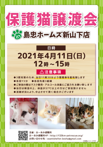 | イベント内容 | ☆★☆★☆★☆★☆★☆★☆★☆★☆★☆★☆★☆★☆★☆★☆★☆★☆★☆★☆ ~4月11日(日)新山下にて譲渡会開催!~ ◎場所・・「島忠ホームズ 新山下店」 神奈川県横浜市中区新山下2丁目12−34 JR根岸線「桜木町駅」より横浜市営バス(8.26.58.148系統)乗車「貯木場前」より徒歩約5分 みなとみらい線「元町・中華街駅」より徒歩約15分 ◎日程・・4月11日(日)(雨天決行) ◎時間・・12時から15時 【14時30分受付終了】 (会場に利用可能な無料駐車場がございます。そちらをご利用くださいませ。) 今回はコロナ対策のため、制限を設けての開催となります。 *3密対策のため、当日11時30分より整理券を配布いたします。 *各回15分 *各回先着3組様 *参加の際は、マスクの着用、アルコール消毒のご協力をお願いいたします。 *当日は検温の上、体温が37度以上の方はご参加いただけません。 *混雑状況により、中止させていただく場合がございます。 ※参加予定の犬猫は体調により参加できない場合があります。ご了承ください。 ☆★☆★☆★☆★☆★☆★☆★☆★☆★☆★☆★☆★☆★☆★☆★☆★☆★☆★☆ |
