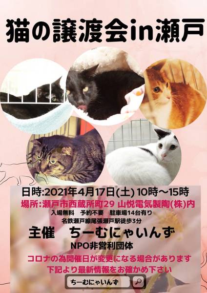 | イベント内容 | 2021年4月17日(第3土曜)の10時~15時に、瀬戸市西蔵所町29山悦電機製陶(株)にて、『保護猫の譲渡会』を開催します!! 当日は、数多くの保護猫さんが参加(20匹前後)を予定しておりますので、是非ともお越しください!(ウサギさんも2頭参加!) ※瀬戸の三大祭りの一つ『陶祖祭り』も開催されており、見どころ満載の瀬戸となっております。 猫さんをお探しの方や、これから猫を飼ってみたいと考えられている方、更に色々な『ネコ話』を聞いてみたい方など、是非お気軽にお越しください! ※見学無料・来場予約不要です ※新型コロナウイルス感染症拡大防止の為、来場時のマスク着用・検温・アルコール消毒液での除菌・少人数(2~3組)ごとの入場・送風機による場内換気・お車での順番待ちなど、様々な制約が生じてしまいますが、何卒ご協力の方をよろしくお願いいたします。 ※コロナ3密対策のため、事前予約のない《他団体のメンバー様》につきましては、ご来場や相談等、一切の対応をお断りさせていただいております。 [主催] ちーむ にゃいんず (NPO 非営利団体) [開催日時] 2021年4月17日(第3土曜)10時~15時 [譲渡会場] 愛知県瀬戸市西蔵所町29 山悦電機製陶(株) ※駐車場有り(14台) ◎ちーむにゃいんず紹介ページ 新しくなりました! [ちーむにゃいんず公式サイト] http://cat-rescue-team.org/ 現在も随時更新中です!(旧公式HP) [ちーむにゃいんずamebaページ] https://team-nyainz.amebaownd.com/ 地域に愛される保護猫団体を目指します! [瀬戸観光協会公式HP内「ちーむにゃいんず」紹介ページ] http://www.seto-marutto.info/member-post/teamnyainz/ フォローをお願い致します [ちーむにゃいんずFacebookページ] https://www.facebook.com/teamnyainz [ちーむにゃいんず Twitter] https://twitter.com/nyains_seto お問合せ先 [譲渡会や里親さん希望の方のお問合せは↓] nekomadohouse@yahoo.co.jp [保護猫活動ボランティアにご参加希望の方は、こちらへ↓] nekomado1@yahoo.co.jp ★只今、保護猫ボランティアのメンバーを大募集中です! 現在のところ、主に瀬戸市内中心部と豊明市内で保護猫の譲渡会を定期開催致しておりますが、愛知・岐阜・三重を中心にした中部地方全域にその活動エリアを拡大中ですので、少し離れた方でも全然OKです! ※経験不問(未経験の方でも、サポートさせていただきます!) ・譲渡会当日の各サポーターさん(受付・場内案内・保護主さんのサポートなど) ・譲渡会以外の日の宣伝活動(各媒体での宣伝・チラシ&募金箱等の設置先紹介など) ・チビ猫さんのミルクボランティア ・子猫さん&成猫さんの預かりさん ・保護猫活動及びTNR活動時の捕獲・保護作業 その他、何らかの保護猫活動にメンバーとして協力していただける方は、下記のメールアドレスの方まで、お問い合わせください。 《お問合せ先》 NPO非営利団体 ちーむ にゃいんず 共同代表 南 貴博 まで↓ nekomado1@yahoo.co.jp ★NPO非営利団体「ちーむにゃいんず」 ・瀬戸観光協会 指定(会員)登録団体 ・瀬戸市社会福祉協議会(会員)登録団体 ・瀬戸市民活動センター(会員)登録団体 ・豊田市愛護センター 登録団体 ・名古屋市愛護センター 登録団体 ・岐阜県保健センター(全11ヵ所)登録団体 ・岐阜市保健センター 登録団体 など ★保護猫たちの為に、募金をお願いいたします! 三菱UFJ銀行 瀬戸支店(セト) 普通口座 0267649 口座名義 チーム ニャインズ ミナミ タカヒロ まで、よろしくお願いいたします。 |