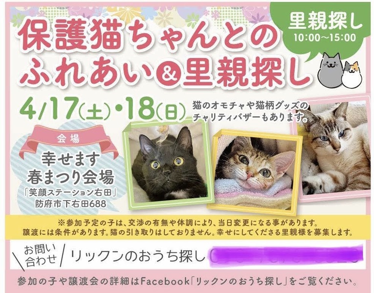 | イベント内容 | 日時 4月17日(土) ~18日(日) 10時~15時 まつりは9時から 場所 防府市大字下右田688 笑顔ステーション右田 (右田小西) 幸せます春まつり2021外テント会場にて *駐車場あり *譲渡費用はありませんが、譲渡には条件があります。里親希望の方はアンケートにご記入をお願いします。 *子猫は体調によって写真参加となります。トライアル予約は受付けます。 *チャリティバザーもあります! ●手作り猫キッカー、猫三角オモチャ。 ●ペット用品 ●犬柄、猫柄のバック、ポーチ、ヘアゴムなど *猫の里親を考えておられる皆さんのお越しをお待ちしています。 |