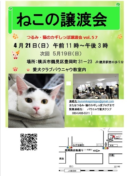 | イベント内容 | ●日時:4月21日(日) 11:00-15:00 ●会場:愛犬クラブ バウニャウ 神奈川県横浜市鶴見区豊岡町31-23 JR鶴見駅より徒歩5分 ●詳細:http://tsurumineko.blog9.fc2.com/ ●概要: 空調の利いた清潔な室内、カーペットのフロアで座ってゆっくり猫と会うことができます。 たくさんの子猫・中ネコ・大人ネコが家族を探して参加します♪ フリーになっている猫もいます、猫を触る際は必ずスタッフの指示に従ってください。 参加猫は随時ブログに掲載します お見合いをご希望の際にはアンケート用紙に環境(住宅・家族構成・住所etc)をご記入いただいています。 譲渡条件がございますので、予めこちらをご覧ください ⇒ 猫の譲渡について http://tsurumineko.blog9.fc2.com/blog-entry-2.html *子猫については長時間のお留守番のないご家庭を探しています *個人保護者の保護猫に関しては会とは譲渡条件が異なる場合があります、 それぞれの猫の紹介記事に譲渡条件、費用等について併記しておりますので、ご覧ください。 当日のお届けはしておりません。 後日、住所・ご家族様の同意などの確認のためご自宅までお届けいたします。 トライアル時書類をご記入いただきます。 *譲渡会前にお話の進む場合もあります、 気になる子がいらした方は事前にお問い合わせをお願いいたします。 ●連絡先⇒tsurumikagishippo@gmail.com または当ブログコメントまで http://tsurumineko.blog9.fc2.com/ 緊急連絡先:愛犬クラブバウニャウ Tel:080-5488-5511 |