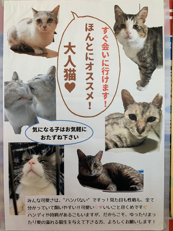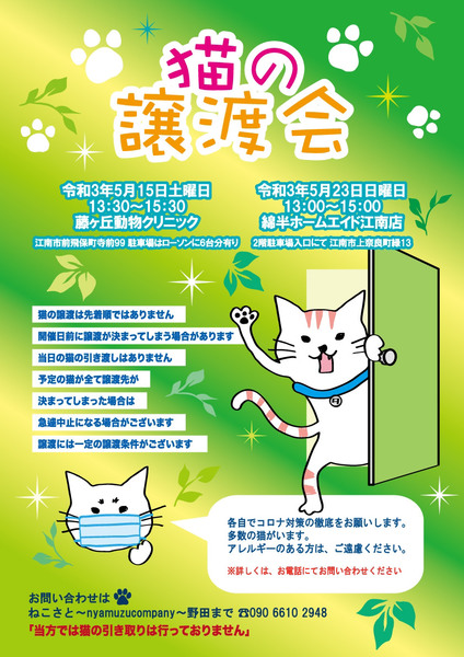 | イベント内容 | 江南市にある藤ケ丘動物クリニックでの開催です☆ 沢山の猫たちがご縁を待っています! 猫を家族へお考えの方は是非お越し下さいませ!!! 検討しているが分からない事や不安な事がある…といった方も、しっかりとヒアリングさせてもらいますのでお気軽にお越し下さい! ※脱走対策の徹底の為、会場では猫を出して触ったり抱っこしたりは出来ません。 ※譲渡条件がございます。 ※当日の猫の引き渡しはありません。 ※猫の体調によって参加頭数は変動があります。 ※先着順ではなく条件に合った方への譲渡ですのでお断りさせていただく場合もございますのでご理解ご了承をお願い致します。 ※会場ではコロナ対策を徹底しておりますので、手指消毒、マスク着用、順番でのご案内となります。ご協力をお願い致します。 |