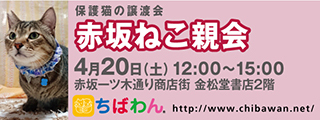 | イベント内容 | 赤坂にある老舗書店である金松堂書店さまのご厚意により、金松堂ビル2Fにてちばわんねこ親会を開催させて頂く事になりました。 可愛い保護猫たちが新しい家族との出会いを求めて参加します!! 見学は予約等必要ありません。ぜひお誘いあわせの上ご参加ください。 参加猫情報は順次更新されます。 ちばわんHPをご覧ください。 http://chibawan.net/eventcat/eventall なお、千葉県市川市、神奈川県横浜市でもねこ親会を開催中です。詳しい日程などはちばわんのHPからご覧ください! ◆◆◆◆◆◆◆◆◆◆◆◆◆◆◆◆ 日時 4月20日(土)12:00-15:00 場所 107-0052 港区赤坂5-1-3 金松堂ビル2F 室内開催 雨天決行(荒天中止) ◆◆◆◆◆◆◆◆◆◆◆◆◆◆◆◆ 【会場内でのお願い】 ・当日、会場内への犬猫等の愛玩動物の同伴は出来ません。 ・譲渡が決定した場合、後日猫をご自宅へお届けいたします。当日猫をお引渡しすることはございません。 【アクセス】 ・東京メトロ千代田線「赤坂駅」より徒歩約3分 ・東京メトロ銀座線、丸の内線「赤坂見附駅」より徒歩約5分 ※会場に駐車場はありません。車でお越しの場合は、付近のコインパーキングをご利用ください。 電車・バスなどの公共の交通機関の利用をお勧めいたします。 【当日の流れ】 (1)家族募集中のねことお会いになりたい方はどなたでも自由にご参加いただくことができます。ちばわんボランティアは名札をつけておりますので、お声をかけて下さい。 預かりボランティアが控えておりますのでねこの性格や生活習慣など、遠慮なくご質問ください。 (2)ご希望の子が決まったら、お申し込みアンケートにご記入の上、ボランティアにお渡し下さい。 (前日までにメールでアンケートを送信してお申し込みいただくこともできます。) ◆「ねこ」アンケート送信先:(以下URLをクリックするとフォームが開きます) http://chibawan.net/contactform_cat (3)アンケート内容を拝見し、お話させていただきます。 (4)原則として一両日中にお返事の連絡をさせていただきます。 (5)ご縁が成立した場合には、後日、こちらからご自宅まで猫をお届けし、約1ヶ月のお試し生活に入っていただきます。お届けの際に、書面での譲渡契約書を交わします。 ※ワクチン・不妊手術代など保護にかかった費用は、家族になる方にもご負担をお願いしています ◆ねこ親会について:(以下URLをクリックするとフォームが開きます) http://chibawan.net/inquiry_cat ※イベント当日はメールを見ることが出来ません。また、お問い合わせの際は、必ず「具体的な件名」を入れて多数の迷惑メールと区別がつくようにお願いいたします。 ※業務に支障がでる恐れがありますので本イベントに関する金松堂書店様へのお問い合わせはご遠慮ください。 |
