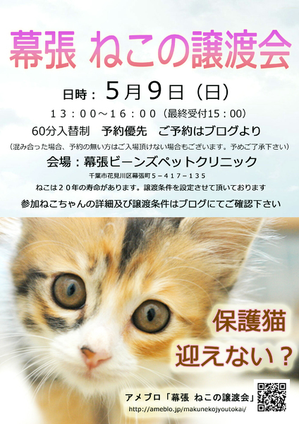 | イベント内容 | 猫下僕募集中! お猫様がお気に召して頂けるお食事選びに常にお金と時間とエネルギーを費やし、 お猫様が気落ち良くお休み頂けるようベッドを陽に干しフカフカにし、 お猫様が飽きないよう新しいオモチャが無いか日々チェックをし、 「我を撫でよ」と言われたら心を込めて撫でさせて頂き、 お猫様が自ら膝から降りられるまでトイレを我慢する事が出来る、 コタツの中で足が延ばせなくても良い、 TVのチャンネルも、居心地の良いソファも、ベッドの真ん中も お猫様にお譲り出来る そんな猫下僕になりたい方 アナタのお猫様がお待ちしております(=^・^=) 5月9日(日)はぜひ「幕張ねこの譲渡会」へお越し下さい♪ …………………………………………………………………… 予約優先 60分入れ替え制にて開催です (確実にご入場頂ける為に、大変お手数ではございますが出来るだけご予約をお願い致します。 密にならないよう会場内の人数を制限して行います。 ご予約無しでもご入場頂けますが、混み合った場合は、大変申し訳ございませんが、 先にご入場されている方が退場されるまで外でお待ち頂くか、 場合によってはご入場頂けないケースもあるかと想定しています。 予めご了承下さい。) *コロナウイルスの影響により、必ずマスク着用をお願い致します。 受付にて検温させて頂き、37℃以上の方は入場をお断りさせて頂きます。 *体調がお悪い方や、ご家族に体調がお悪い方がいらっしゃるご家庭の方は 大変申し訳ございませんが、当日キャンセルで結構ですので、よろしくお願い致します。 後日、個別でのお見合いや、次回譲渡会でお待ちしています。 *譲渡会への参加のご予約は「アメブロ 幕張ねこの譲渡会 譲渡会参加お申込みはコチラ」 https://ameblo.jp/makunekojyoutokai/entry-12632582368.html をご覧頂きメールにてご連絡下さい。 参加人数やご希望のねこちゃんによってお時間を調整し、 後日メールにてご連絡させて頂きます。 *60分滞在してもお申込みの猫ちゃんが決まらない方はご退室頂き後日メール等でお申込み頂くなどの対応をお願い致します。 日時: 令和3年5月9日(日) 完全優先 13:00より16:00(最終受付15:00) 会場:幕張ビーンズペットクリニック 千葉市花見川区幕張町5-417-135 譲渡会会場はお借りしているだけですので会場へのお問合せはご遠慮下さい。 お問い合わせは makunekojyoutokai★★gmail.com までお願い致します (★★を@に変えてお送りください) お車でお越しの場合は施設駐車場 もしくは近隣のコインパーキング(有料)をご利用下さい。 ★譲渡の流れ及び譲渡条件はコチラです 必ずご覧下さい https://ameblo.jp/makunekojyoutokai/entry-12301780427.html 新しい小さな家族に出会いにいらっしゃいませんか? 小さな譲渡会ですが、皆様のご来場をスタッフ一同心よりお待ちしています。 |