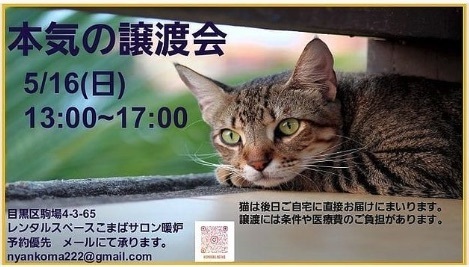 | イベント内容 | 主に個人猫ボランティアさんたちが多く参加する猫の譲渡会です♪ [主催] 保護猫譲渡会カフェ こまばサロン暖炉 [FBページ] https://www.facebook.com/nyankomaba [FBイベント] https://www.facebook.com/nyankomaba/events ※必ず上記URLの主催者様のページをご確認ください。 -------------------- 2021/5/16(日) 13:00~17:00 東京都目黒区駒場4-3-65 こまばサロン暖炉 にて保護猫譲渡会を開催します。 ※予約優先制となりました。 60分毎入れ替え制 各回10名限定 早くにいらっしゃっても時間前には入れません。 60分で猫ちゃんを選んで、お申し込みの方はお申し込みのお部屋へ移動してください。 お申し込みのない場合はそのままご退出ください。 ご予約は nyankoma222@gmail.com に、 以下の点を添えてお申し出ください。 ・名前(ニックネーム可) ・希望時間帯(①13:00~②14:00~③15:00~④16:00~) ・人数(なるべく2~3名に抑えて下さい) ・会いたい猫がいれば猫の名前 トラブル防止のため、電話ではなくメールでのご予約をお願いします。 現時点での予約状況はFacebookのイベントページで順次更新されますのでご確認ください。 様々な理由で保護された猫達の里親さんを探す譲渡会です。 個人ボランティアが多く参加しますので、 保護主によって応募条件や譲渡費用が異なります。 新型コロナウイルス感染対策としては、開催前は次亜塩素酸水と高温スチームモップによる床などの除菌・清掃を行います。 開催中は定期的な換気を行い、手指の消毒スプレーなど複数設置します。 会場へはマスクの装着必須です。 入り口で検温と消毒をします。 当日咳および発熱の症状のある方はご来場をご遠慮ください。 だっこやお触りなどのふれあいも出来ません。 猫が見たいだけ、飼いたいけどペット不可住宅に住んでいる、3年後に飼うつもり、家族が反対しているなど、すぐに猫を飼えない方のご参加はご遠慮下さい。 本気で猫を飼いたい方に参加して頂きたい譲渡会です。 飼いたいけれど今回はビビっと来なかったという方に無理矢理猫を勧めたりはしないのでご安心ください。 当日の猫のお渡しは出来ません。 カンパや寄付などは玄関前でのお引き取りになります。 |
