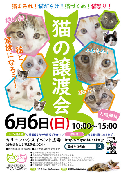 | イベント内容 | 「ちっちゃな譲渡会・子猫まつり第1弾」を6月6日(日)に開催! 三好っ子19匹(年少さん17匹、年長さん2匹)が譲渡会デビュー。 *事前お見合い、予約は受け付けておりません。 スタッフと来場者の安全のためにコロナ対策を強化します。 会場前で整理券をお渡し後、順番にご案内いたします。 入場をグループ制とさせていただき、各グループ10人程度、会場内の滞在時間を40分程度に制限します。 ▼子猫まつりだ、ワッショイ♪ワッショイ♪ 6月6日(日)10時~15時 三好丘カリヨンハウスイベント広場(屋根付き屋内施設) 愛知県みよし市三好丘2-2-1 *入場時の検温と消毒、会場内でのマスク着用のご協力をお願いします。 *来場者多数の場合は入場制限を行う場合があります。 ●譲渡が決まると猫トイレ、トイレ砂5L×2袋をもれなく進呈。 1匹につき1セットご提供、複数の場合は頭数分をご提供します。(11月末まで期間延長!!) http://miyoshineko.sblo.jp/article/188311208.html ●無料駐車場48台完備、電車なら駅から徒歩1分です。 第一と第二駐車場がありますが譲渡会ではすぐに満車になります。 満車時はお近くのコインパーキングにお願いします。 主催:NPO法人三好ネコの会 http://miyoshi-neko.jp |