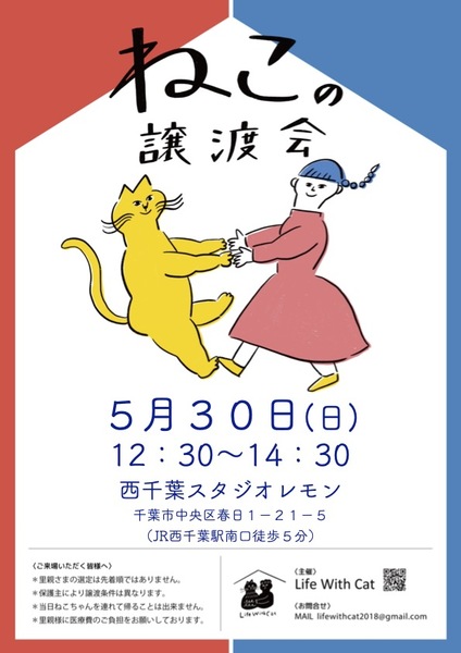 | イベント内容 | 第55回 Life With Cat『ねこの譲渡会』 5月30日(日曜日) 12:30~14:30 <会場> レンタルスタジオレモン 260-0033 千葉市中央区春日1丁目21-5 (JR西千葉駅/京成西登戸駅より徒歩4分) *駐車場のご用意はございません。 スタジオより徒歩1分圏内にコインパーキングが多数ありますので そちらをご利用ください。 来場人数により入場制限をする場合もございますので予めご了承くださいませ。 ---お願い--- コロナウィルスなどの感染予防のため ご来場の際は「マスク着用」「入り口でのアルコール消毒」「会場内ではお客様同士の感覚の確保」 にご協力頂き風邪のような症状のある方や体調の悪い方はご来場を見合わせてください。 また基礎疾患のある方のご来場も控えていただいた方が賢明です。 ----------- 以下の条件を満たしているご家庭のご来場をお待ちしております! ・子猫の場合 急病に速やかに対応できるお留守番が4時間程度のご家庭 (単独世帯の方に子猫は譲渡しておりません) ・年齢が成人~55歳以下で就労し安定した収入のあるご家庭 *会いたい猫ちゃんがいる場合はブログのお問い合わせフォームから事前にお知らせください。 里親さまの選定は先着順ではありませんがお知らせのない猫ちゃんは条件が合えばその場で決定してしまう場合がございます。 *保護主により譲渡条件は異なります。 *当日ねこちゃんを連れて帰ることは出来ません。 後日 保護主が里親様宅へお届けいたします。 *里親様に医療費のご負担をお願いしております。 |