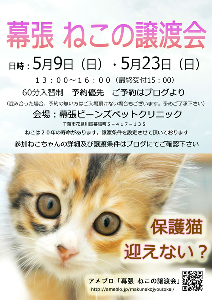 | イベント内容 | げぼくさん募集中!www お猫様がお気に召して頂けるお食事選びに常にお金と時間とエネルギーを費やし、 お猫様が気落ち良くお休み頂けるようベッドを陽に干しフカフカにし、 お猫様が飽きないよう新しいオモチャが無いか日々チェックをし、 「我を撫でよ」と言われたら心を込めて撫でさせて頂き、 お猫様が自ら膝から降りられるまでトイレを我慢する事が出来る、 コタツの中で足が延ばせなくても良い、 TVのチャンネルも、居心地の良いソファも、ベッドの真ん中も お猫様にお譲り出来る そんな猫げぼくになりたい方 アナタのお猫様がお待ちしております(=^・^=) 5月23日(日)はぜひ「幕張ねこの譲渡会」へお越し下さい♪ 野田52匹多頭崩壊現場よりレスキューのコも参加致します。 皆様のご来場、お待ちしています!!! …………………………………………………………………… 予約優先 60分入れ替え制にて開催です (確実にご入場頂ける為に、大変お手数ではございますが出来るだけご予約をお願い致します。 密にならないよう会場内の人数を制限して行います。 ご予約無しでもご入場頂けますが、混み合った場合は、大変申し訳ございませんが、 先にご入場されている方が退場されるまで外でお待ち頂くか、 場合によってはご入場頂けないケースもあるかと想定しています。 予めご了承下さい。) *コロナウイルスの影響により、必ずマスク着用をお願い致します。 受付にて検温させて頂き、37℃以上の方は入場をお断りさせて頂きます。 *体調がお悪い方や、ご家族に体調がお悪い方がいらっしゃるご家庭の方は 大変申し訳ございませんが、当日キャンセルで結構ですので、よろしくお願い致します。 後日、個別でのお見合いや、次回譲渡会でお待ちしています。 *譲渡会への参加のご予約は「アメブロ 幕張ねこの譲渡会 譲渡会参加お申込みはコチラ」 https://ameblo.jp/makunekojyoutokai/entry-12632582368.html をご覧頂きメールにてご連絡下さい。 参加人数やご希望のねこちゃんによってお時間を調整し、 後日メールにてご連絡させて頂きます。 *60分滞在してもお申込みの猫ちゃんが決まらない方はご退室頂き後日メール等でお申込み頂くなどの対応をお願い致します。 日時: 令和3年5月23日(日) 予約優先 13:00より16:00(最終受付15:00) 会場:幕張ビーンズペットクリニック 千葉市花見川区幕張町5-417-135 譲渡会会場はお借りしているだけですので会場へのお問合せはご遠慮下さい。 お問い合わせは makunekojyoutokai★★gmail.com までお願い致します (★★を@に変えてお送りください) お車でお越しの場合は施設駐車場 もしくは近隣のコインパーキング(有料)をご利用下さい。 ★譲渡の流れ及び譲渡条件はコチラです 必ずご覧下さい https://ameblo.jp/makunekojyoutokai/entry-12301780427.html 新しい小さな家族に出会いにいらっしゃいませんか? 小さな譲渡会ですが、皆様のご来場をスタッフ一同心よりお待ちしています。 |