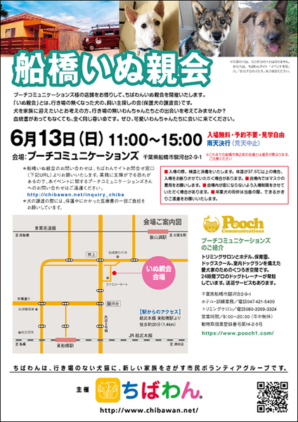| イベント内容 | 6月船橋いぬ親会のご案内です。 poochさんのご厚意により、プーチコミュニケーションズ(船橋市駿河台)のドッグランをお借りして「船橋いぬ親会」を継続開催することになりました。 屋根付きのドッグランでの開催になります。 【ちばわんからのお願い】 ①会場内ではマスクの着用をお願いします。 ②入場の際、検温と消毒をいたします。体温が37.5℃以上の場合、入場をお断りさせていただく場合があります。 ③会場内が密にならないよう入場制限をさせていただく場合があります。 ④卒業犬の同伴は当面の間、ご遠慮をお願いいたします。 開催日:6月13日(日)11:00~15:00 屋外開催(屋根付きドッグラン) 小雨決行 場所:プーチコミュニケーションズ 千葉県船橋市駿河台2-9-1 【アクセス】 プーチコミュニケーションズ 飯山満駅から徒歩約20分 JR東船橋駅から徒歩約20分 県道8号線 吹上交差点~駿河台交差点間にあるファミリーマートの裏手になります。 リサイクルショップとファミリーマートの間の道へ進み、最初のT字路を左折してください。 ※店舗の駐車場は5台分のみとなりますので混雑時にはご利用いただけない場合がございます。 満車の場合はコインパーキングをご利用下さい。 《注意事項》 【当日の流れ】 (1)家族募集中のいぬとお会いになりたい方はどなたでも自由にご参加いただくことができます。ちばわんボランティアは名札をつけておりますので、ご遠慮なくお声をかけて下さい。また、募集中のいぬのそばには預かりボランティアが控えておりますのでいぬの性格や生活習慣など、遠慮なくご質問ください。 (2)ご希望のいぬが決まったら、お申し込みアンケートにご記入の上、ボランティアにお渡し下さい(前日までにメールでアンケートを送信してお申し込みいただくこともできます。) ◆「いぬ」アンケート送信先: http://chibawan.net/contactform_dog (3)アンケート内容を拝見し、お話させていただきます。 (4)原則として一両日中にお返事の連絡をさせていただきます。 (5)ご縁が成立した場合には、後日、こちらからご自宅までいぬをお届けし、約1ヶ月のお試し生活に入っていただきます。お届けの際に、書面での譲渡契約書を交わします。 ※ワクチン・不妊手術代など保護犬にかかった費用は、家族になるいぬ親さんにもご負担をお願いしています 《お知らせ》 ◆会場ではチャリティグッズを販売します 売上金は保護した犬猫の医療費など、 ちばわん活動費として大切に使わせていただきます 《お問い合わせ》 いぬ親会について:http://chibawan.net/inquiry_chiba ※いぬ親会当日はメールが見られません。また、お問い合わせの際は、必ず「具体的な件名」を入れて多数の迷惑メールと区別がつくようにお願いいたします。 ※本イベントに関するPoochさんへのお問い合わせはご遠慮ください。 船橋いぬ親会イベントホームページ https://chibawan.net/event/20210613-funabashi-dog ちばわんホームページ https://chibawan.net/ |