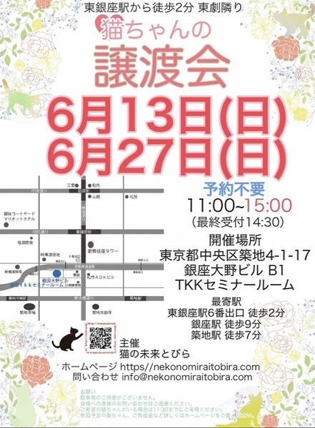 | イベント内容 | 東銀座で保護猫の譲渡会を開催しています「猫の未来とびら」です♪ 恵まれない環境にいる猫たちが未来へのとびらを開いて幸せなご縁に繋がる橋渡しをしていきます。 たくさんの猫ちゃんと保護主・スタッフ一同みなさまのご来場を心よりお待ちしています! 子猫ちゃん〜成猫ちゃんまで参加します♪ ※ご来場頂く方と私たち保護主、スタッフの安心と安全の為、感染リスクを限りなく低減させる為、私たちが出来うる対策をしてお待ちしております※ 【ご来場いただく皆様には下記についてお願い致します】 ★マスクの着用をお願い致します。 (マスク着用のない方は入場出来ません) ★譲渡会場にお入り頂く前に検温・手洗いと手の消毒、検温をお願い致します。 ★ソーシャル・ディスタンス(人と人との間隔を開ける)をお願い致します。 ★熱のある方や体調の優れない方は譲渡会への来場を見合わせて頂けますよう、お願い致します。 ★来場者数によりましては人数制限もありますので長時間お待たせてする場合もございます。 予めご了承下さい。 ★混雑時は受付を途中で中止する場合もありますのでご了承ください。 コロナウイルス感染拡大防止の為、厳しいお願いで大変恐縮ですが何卒ご理解とご協力、ご了承をいただけますようお願い致します。 ★☆★★☆★★☆★★☆★★☆★★☆★★☆★★☆★★☆★ ★開催日時 2021年6月13日(日) 11:00~15:00 (最終受付 14:30) ★11時00分より1階エントランスにて整理券を配布致します。 ★会場 東京都中央区築地4-1-17 銀座大野ビル B1 TKKセミナールームさんにて (東劇となり) ★最寄駅 東銀座駅 6番出口 徒歩2分 銀座駅 徒歩9分 ・築地駅 徒歩7分 駐車場は当ビルの駐車場または近隣のコインパーキング等をご利用ください。 会場への直接のお問い合わせはご遠慮くださいませ。 ★☆★★☆★★☆★★☆★★☆★★☆★★☆★★☆★★☆★ 会場で猫ちゃんと触れ合ってご縁を繋いでください。 里親様・猫ちゃんが双方、幸せな家族になれるよう保護主・スタッフがサポート致します。 ご不安な事はお気軽にご相談ください。 入場無料です。事前のご予約は不要です。 当日猫ちゃんの引き渡しはございません。 後日、保護主が里親様宅へお届けいたします。 ※参加予定猫ちゃんは、急な体調不良等で不参加になる場合もございます。 開催当日の朝、当会ブログにて不参加の最新情報を掲載致しますのでご確認をお願い申し上げます。 ◇譲渡に関してのお願い・基本条件 1.家族の一員として終生最期まで愛育下さい。 2.完全室内飼い・ペット可のお住まい 3.脱走防止対策 4.避妊・去勢手術 5.里親様のご自宅へのお届け 6.譲渡誓約書への署名捺印・身分証明書の提示 7.医療費譲渡金のご負担 8.定期報告 9.トライアル期間有り ※保護主により譲渡条件は異なりますので会場で直接ご相談ください。 60才以上の方のみのご家庭、未成年の方、単身の方、同棲中の方、 小学生低学年以下のお子様のいる方、必要な脱走対策を施していただけない方は譲渡が出来かねますのでご了承ください。 仔猫の場合は主にお世話される方のご年齢は55歳までとさせて頂きます。 オーバーする方はご相談くださいませ。 小さな子猫の譲渡は体重が1kgになってからのお届けやお留守番の無い(少ない)ご家庭を希望いたします。 動物も病気になったり、年老いた場合には介護が必要になる場合がございますので、その時にきちんと必要な医療費を捻出出来る、経済力がある里親さまへの譲渡となります。 医療費譲渡金に関しましては詳しくはホームページの 【譲渡に関してのお願い】【譲渡の流れ】をご覧くださいませ。 ~主催 猫の未来とびら~ |