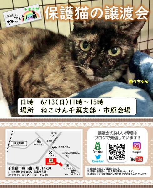 | イベント内容 | 今回も通常スタイルの譲渡会と致しますが、コロナウイルス対策として ・会場内ではマスクのご着用と入退室の際は消毒をお願い致します。 ・ご予約無しでお越しいただけますが、混雑時は整理券を配らせていただきます。 ご協力の程よろしくお願い致します。 成猫は指名制のお見合いとさせていただく子もおりますので、 『◯◯ちゃんと、お見合い希望』とご指名の事前申し込みをお願い致します。 ねこけん千葉支部のブログ内にありますお問い合わせフォームより、 ⚫︎お名前 ⚫︎ご住所(市区町村までで大丈夫です) ⚫︎お見合いご指名猫の名前を、お知らせください。 ※締め切りは譲渡会前日6月12日(土)18時までとなっております。 ねこけん千葉支部ブログ→ https://ameblo.jp/nekoken-chiba/ また、譲渡会会場では、千葉県内にお住いの預かりボランティアさん及びお世話ボランティアさんを募集しています。 ご希望の方は、大変お手数をおかけしますが、譲渡会までお越しください。 ※ご都合がつかない場合は、お問い合わせ先までご相談ください。 [日時] 6月13日(日)11:00~15:00 [会場] 千葉県市原市古市場614-10 ※屋内での開催となり雨天決行です。 ※抱っこもOK! ※猫ちゃんの負担も考え、ご来場は時間内にお願い致します。 ※特にご予約などは必要ございませんのでご家族皆様でぜひお越し下さい。 ※駐車場あり。 [交通] 交通機関を利用してお越しの方 JR内房線 浜野駅より徒歩13分 浜野駅は、東京駅から京葉線→内房線でおよそ50分の距離!! お車でお越しの方 京葉道路蘇我インターより車で10分 ※駐車場はラジコンショップハッピー様裏手にございます駐車場をご利用ください [譲渡ご希望の方へのお願い] 誠に恐れ入りますが下記に当てはまります方への譲渡は不可となりますので予めご了承下さい。 ①学生さん、未成年の方、安定収入のない方 ②ペットを飼う事を許されていない住宅にお住まいの方 ③身体的、精神的疾病で治療中の方 ※60歳以上の方は別途条件がございますのでご相談下さい。 [譲渡の流れ] お申込み→審査→後日お届け→トライアル→正式譲渡 ※当日のお連れ帰りは出来ませんので予めご了承ください。 ※仮譲渡時にご希望の猫ちゃんにかかった医療費(血液検査・ワクチン・駆虫・不妊去勢手術等)をご負担願います。 しかし、正式譲渡に至らなかった場合は医療費を全額返済致します。 [主催] 動物愛護団体 NPO法人ねこけん 千葉支部 [ブログ] https://ameblo.jp/nekoken-chiba/ [参加動物] 成猫・子猫(ねこけん保護猫以外の猫ちゃんも参加予定です) [お問い合わせ] ご不明な点、ご質問等ございましたら下記までお問い合わせください。 chiba.info@nekoken.jp |