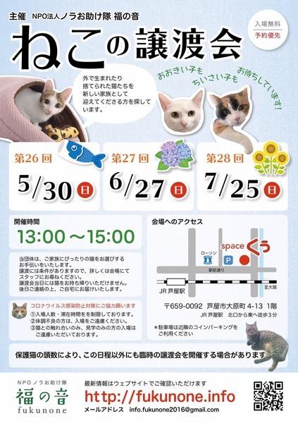 | イベント内容 | 既にいっぱいになりましたので、キャンセル待ちになります。 保護された今年生まれの子猫が参加予定です。 コロナ渦、万全の態勢で運営しておりますので、来られる際にはマスクの着用をしてください。 また体調のすぐれない場合は無理をせず、次回の参加でお願いします。 こちらでは参加を希望の方には、ご予約をして貰っておりますので、必ず予約を取ってからお越しください。 予約は、『猫のミーナ』のホームページのお問い合わせにご連絡をください。 ペット不可にお住まいの方は、ご遠慮ください。 猫は後日こちらからお届けをさせて頂き、ご自宅の環境を見せて頂ければと思います。 猫は20年くらい生きる子もいますので、ご自身の年齢に合った猫さんとの出会いを探しに来てくださいネ。 譲渡には条件がありますので、ご理解頂きますようお願い致します。 会場には、JR芦屋駅から徒歩3分ほどです。 車でお越しの方は、近隣にはコインパーキングがあります。 |