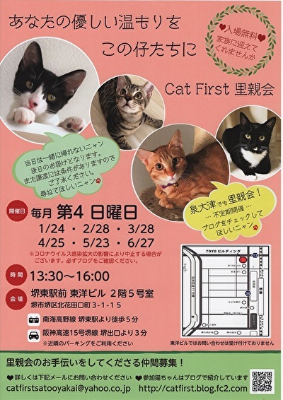 | イベント内容 | 〈皆さまへのお願い〉 ※コロナウィルス感染拡大防止の為、当日はマスク着用でお越し下さい。 ※また消毒、検温のご協力お願い致します。 ※換気の為に会場の窓、入り口ドアを開放します。 その為猫の脱走防止対策として抱っこ、ケージのドアを開けての触れ合いは 原則禁止とします。 ※面談の際、スタッフはフェイスシールド着用させて頂きます。 ※状況によりましては入場制限、時間制限を設ける場合がございます。 時間に余裕を持ってお越し下さい。 皆様にはご迷惑おかけ致しますが 何卒、ご理解ご協力のほど宜しくお願い致します。 ⚫︎入場料は無料です。 ⚫︎近隣にはコインパーキングもございます。 ⚫︎東洋ビルへのお問い合わせはご遠慮願います。 ⚫︎当日、猫は連れて帰れません。 ⚫︎里親会開催までに里親様が決まったり、 体調不良等の理由で当日参加できない場合がございます。 お問合せ先 catfirstsatooyakai@yahoo.co.jp ブ ロ グ http://catfirst.blog.fc2.com |