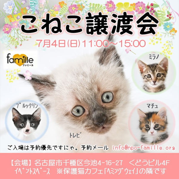 | イベント内容 | 仔猫の譲渡会(名古屋・今池) NPO法人ファミーユ https://www.npo-famille.org 皆様のお越しをお待ちしております! ⭐️会場は地下鉄今池駅4番出口から徒歩3分です ⭐️車の方は近隣にコインパーキングがたくさんあります ⭐️お見合いご希望の方はメールで事前予約いただくと、当日スムーズにご案内できます ご注意 ◆マスク着用でご来場をお願いします ◆混雑防止の為、【アンケート提出済+お見合いの時間予約をされている方】を優先させていただきます ◆来場者多数の場合、会場の外でお待ちいただくことがございます ◆譲渡会でのお見合い希望のメール連絡は、前日16時までにお願いします。申し訳ございませんが、それ以降は対応致しかねます ◆仔猫は体調を崩しやすく、飼育にはこまめな温度管理が必要です。健康や安全性を考慮し、お留守番6時間以内が理想的です ・譲渡までの流れはコチラをご覧ください。 *正式譲渡前に最長2週間のトライアル期間を設けておりますので、「先住ペットとの相性が心配」という方は期間中にじっくりご検討ください。 *猫の体調によっては、当日欠席する場合があります。会いたい仔がいる場合は、来場予約がおすすめです。 *来場予約、お問合せはメールでお願いします info@npo-famille.org |