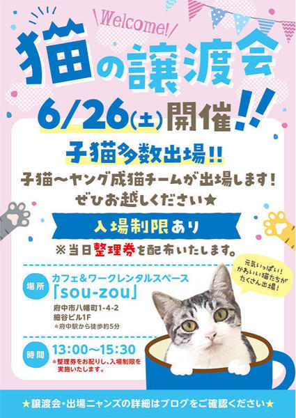 | イベント内容 | 譲渡会のお知らせ お待たせ致しました! 6月の譲渡会のお知らせです。 今回の譲渡会は、かわいい子猫達やヤング成猫さん達が約30匹参加予定です。 コロナ対策を万全に開催させていただきますので、よろしくお願い申し上げます。 【日時】6月26日(土)13時〜15時30分 【場所】カフェスペースsou-zou ↓↓↓ https://ameblo.jp/team-rose-cats/entry-12495068487.html ◉子猫多数参加!(15匹) ◉ヤング成猫多数参加!(15匹) (※参加にゃんずは、後ほど発表します!出場する子達の情報をいち早く知りたい方は、YouTubeの『ちゅー猫チャンネル』をご覧になられると保護猫達の様子がわかります!) ◉完全予約制ではありませんが、整理券を配布し、入場制限をさせていただきます。 (コロナ感染防止の為、一組様30分制限とさせていただきます) ◉密を避ける為に、本気で猫を迎えたい方々のみのご参加でよろしくお願い申し上げます。 ◉見学などは受け付けておりませんのでご了承ください。 ◉譲渡会に参加予定の方は、必ずこちらをご参照ください。 ↓↓↓ https://ameblo.jp/team-rose-cats/entry-12174516271.html ※お願い※ 開催する我々もコロナ対策には十分に気を配っでおります。 マスク着用、消毒、体温チェックのご協力をよろしくお願い申し上げます。 ============================================================= ❤️出場にゃんず❤️ 【多頭崩壊チーム全15匹】 ◆一歳未満黒♂キジトラ♂キジ白 https://chuneko.exblog.jp/32182020/ ◆一歳未満キジトラ♂キジトラ♂キジトラ♀ https://chuneko.exblog.jp/32182043/ ◆一歳未満キジトラ♂一歳ちょっとキジトラ♂ https://chuneko.exblog.jp/32182061/ ◆一歳未満キジトラ♂一歳ちょっとキジトラ♂ https://chuneko.exblog.jp/32182081/ ◆一歳ちょっとキジトラ♀キジ白♀ https://chuneko.exblog.jp/32182114/ ◆一歳ちょっとキジトラ♀キジ白♀キジ白♀ https://chuneko.exblog.jp/32182127/ 【子猫チーム全15匹】 ◆約3ヶ月子猫 白茶♂ キジ三毛♀ https://chuneko.exblog.jp/32182229/ ◆約3ヶ月子猫 白茶♂ 白茶♂ 三毛♀ https://chuneko.exblog.jp/32182334/ ◆約3ヶ月半子猫 キジ白♀ キジトラ♂ https://chuneko.exblog.jp/32182660/ ◆約3ヶ月半子猫 キジトラ♂ キジトラ♀ https://chuneko.exblog.jp/32182660/ ◆約2ヶ月半子猫キジトラ♀ 約3ヶ月キジ白♂ https://chuneko.exblog.jp/32183897/ ◆約3ヶ月子猫 黒白♂ キジ白♀ https://chuneko.exblog.jp/32183897/ ◆約3ヶ月子猫 黒白長毛♂ キジ白♂ https://chuneko.exblog.jp/32183986/ |