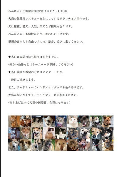 | イベント内容 | 平等院隣接地 ★予約は必要ありませんが、会いたい犬猫が決まってるかたは事前に必ずその子が参加するかどうかの確認をお願いします。 ①わんにゃん小梅保育園のインスタ、blogなどをみて、会いたい犬猫がいましたらその特徴や名前など明記のうえ、連絡をください ②当日、時間内に来て下さい 問い合わせ先 little-quu@nifty.com 08041423180 (わんにゃん小梅保育園 FARCO) 保健所レスキューの犬猫が参加します。 ★お車でお越しのかたは停められます |