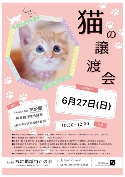 | イベント内容 | ちた地域ねこの会☆とこなめ地域ねこの会☆あぐい地域ねこ猫の会☆合同猫の譲渡会です(=^x^=) 春の出産シーズン後初の譲渡会です。 沢山の子猫が参加予定☆ 参加する猫達は皆、保護宅で精一杯の愛情を持ってお世話をしている猫たちです。当日の体調により不参加になる子もおりますので、ご希望の猫がいましたらご一報ください。 初めて猫を飼う方も相談などできる限りサポートしますので、ご相談だけでもお気軽にお立ち寄りください♪ ~譲渡までの流れ~ ①実際に猫に会ってもらいます。 ②「この子!」と思われる猫がいましたら、トライアル(仮譲渡)をします。 注:必ずこちらから里親希望の方のお家までお届けに行きます。 脱走が強く懸念される場合は、譲渡をお断りすることもございます。 ③誓約書を書いていただきます。 ④通常1週間~10日ほど様子を見て、このまま飼いつづけられると双方が判断した場合に 正式譲渡となります。 また、保護して里親を募集している猫たちは生活環境も健康状態も悪かった子がほとんどです。 譲渡までにかかった治療費やワクチン代など費用の負担をお願いしています。 次の猫につなげるため、ご協力をお願いいたします。 譲渡をする猫は、基本的に以下の3点を満たしています。 ①ワクチンの接種 ②ノミ・ダニ・お腹の虫の駆虫 ③健康状態が良好(下痢・風邪・嘔吐・発熱がない) また、感染症の可能性を考えて保護してから最低2週間は経過した猫です。 ご不明な点は < ちた地域ねこの会 > https://chitaneko.localinfo.jp/ メール:tita_neko@yahoo.co.jp 参加猫などの情報はブログをご覧ください☆ https://ameblo.jp/tita-neko/ |