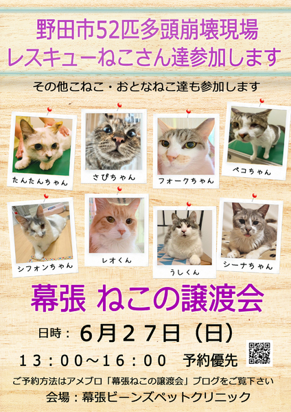 | イベント内容 | げぼく志願者様募集中!www お猫様がお気に召して頂けるお食事選びにお金と時間とエネルギーを費やし、 お猫様が気持ち良くお休み頂けるようベッドを陽に干しフカフカにし、 お猫様が飽きないよう新しいオモチャが無いか日々チェックをし、 「我を撫でよ」と言われたら心を込めて撫でさせて頂き、 お猫様が自ら膝から降りてくれるまでトイレをガマンする事が出来る、 コタツの中で足が延ばせなくても良い、 TVのチャンネルも、居心地の良いソファも、ベッドの真ん中も お猫様にお譲り出来る、そんな猫げぼくになりたい方 アナタのお猫様がお待ちしております(=^・^=) 6月27日(日)はぜひ「幕張ねこの譲渡会」へお越し下さい♪ こねこ・おとなねこ達と 野田52匹多頭崩壊現場よりレスキューのコも参加致します。 皆様のご来場、お待ちしています!!! …………………………………………………………………… 予約優先 60分入れ替え制にて開催です (確実にご入場頂ける為に、大変お手数ではございますが出来るだけご予約をお願い致します。 密にならないよう会場内の人数を制限して行います。 ご予約無しでもご入場頂けますが、混み合った場合は、大変申し訳ございませんが、 先にご入場されている方が退場されるまで外でお待ち頂くか、 場合によってはご入場頂けないケースもあるかと想定しています。 予めご了承下さい。) *コロナウイルスの影響により、必ずマスク着用をお願い致します。 受付にて検温させて頂き、37℃以上の方は入場をお断りさせて頂きます。 *体調がお悪い方や、ご家族に体調がお悪い方がいらっしゃるご家庭の方は 大変申し訳ございませんが、当日キャンセルで結構ですので、よろしくお願い致します。 後日、個別でのお見合いや、次回譲渡会でお待ちしています。 *譲渡会への参加のご予約は「アメブロ 幕張ねこの譲渡会 譲渡会参加お申込みはコチラ」 https://ameblo.jp/makunekojyoutokai/entry-12632582368.html をご覧頂きメールにてご連絡下さい。 参加人数やご希望のねこちゃんによってお時間を調整し、 後日メールにてご連絡させて頂きます。 |