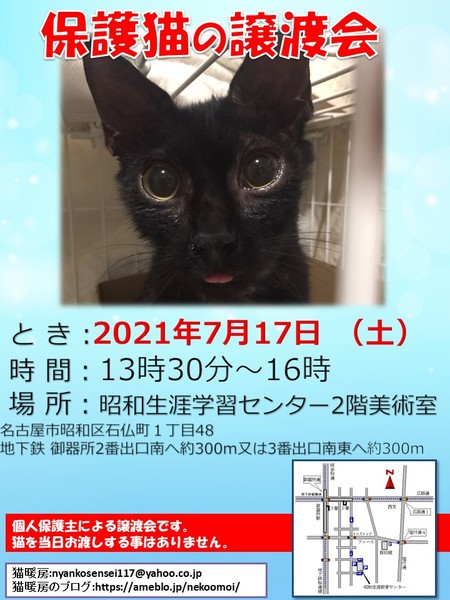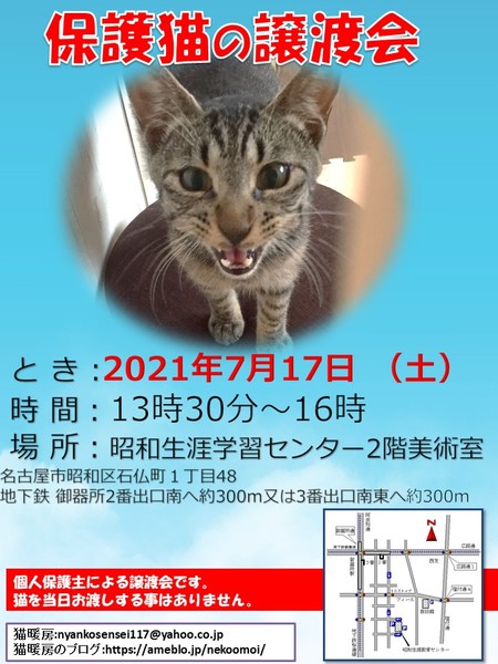 | イベント内容 | 保護猫の譲渡会! 名古屋市昭和区 昭和生涯学習センター2階 美術室にて開催します。 子猫や、少し育った若猫、性格が安定した大人猫が ずっとのおうちを探しています。 個人保護主が集まって共同開催しております。 譲渡条件などは 個々の保護主よりますので 気になる猫さんがいましたら お気軽に保護主にお尋ね下さい。 (^-^) さ ご来場の際 マスクの着用をお願い致します。 マスクはご来場者様でご用意下さい。 希望者の方には アンケート記入をお願いしております。 アンケートを元に お話しをさせて頂きます。 当日 猫を連れて帰る事は出来ません。 お車でお越しの場合 施設駐車場 もしくは 近隣のコインパーキング(有料)をご利用下さい。 路上駐車は 近隣住民のごさ迷惑になりますのでおやめください。 譲渡会会場はお借りしているだけですので 会場へのお問合せはご遠慮下さい。 最寄駅 地下鉄 御器所駅 |
