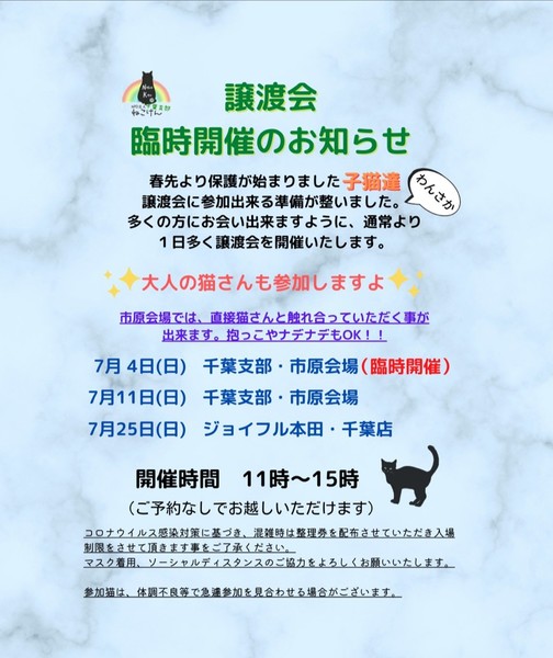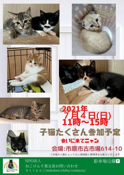 | イベント内容 | この春に生まれ、保護された沢山の子猫達。 元気にスクスク成長し、譲渡会に参加できる準備が整いました。 多くの方にお会いできますように、臨時の譲渡会を開催致します。 通常スタイルの譲渡会と致しますが、コロナウイルス対策として ・会場内ではマスクのご着用と入退室の際は消毒をお願い致します。 ・ご予約無しでお越しいただけますが、混雑時は整理券を配らせていただきます。 ご協力の程よろしくお願い致します。 成猫は指名制のお見合いとさせていただく子もおりますので、 『◯◯ちゃんと、お見合い希望』とご指名の事前申し込みをお願い致します。 ねこけん千葉支部のブログ内にありますお問い合わせフォームより、 ⚫︎お名前 ⚫︎ご住所(市区町村までで大丈夫です) ⚫︎お見合いご指名猫の名前を、お知らせください。 ※締め切りは譲渡会前日7月3日(土)18時までとなっております。 ねこけん千葉支部ブログ→ https://ameblo.jp/nekoken-chiba/ また、譲渡会会場では、千葉県内にお住いの預かりボランティアさん及びお世話ボランティアさんを募集しています。 ご希望の方は、大変お手数をおかけしますが、譲渡会までお越しください。 ※ご都合がつかない場合は、お問い合わせ先までご相談ください。 [日時] 7月4日(日)11:00~15:00 [会場] 千葉県市原市古市場614-10 ※屋内での開催となり雨天決行です。 ※抱っこもOK! ※猫ちゃんの負担も考え、ご来場は時間内にお願い致します。 ※特にご予約などは必要ございませんのでご家族皆様でぜひお越し下さい。 ※駐車場あり。 [交通] 交通機関を利用してお越しの方 JR内房線 浜野駅より徒歩13分 浜野駅は、東京駅から京葉線→内房線でおよそ50分の距離!! お車でお越しの方 京葉道路蘇我インターより車で10分 ※駐車場はラジコンショップハッピー様裏手にございます駐車場をご利用ください [譲渡ご希望の方へのお願い] 誠に恐れ入りますが下記に当てはまります方への譲渡は不可となりますので予めご了承下さい。 ①学生さん、未成年の方、安定収入のない方 ②ペットを飼う事を許されていない住宅にお住まいの方 ③身体的、精神的疾病で治療中の方 ※60歳以上の方は別途条件がございますのでご相談下さい。 [譲渡の流れ] お申込み→審査→後日お届け→トライアル→正式譲渡 ※当日のお連れ帰りは出来ませんので予めご了承ください。 ※仮譲渡時にご希望の猫ちゃんにかかった医療費(血液検査・ワクチン・駆虫・不妊去勢手術等)をご負担願います。 しかし、正式譲渡に至らなかった場合は医療費を全額返済致します。 [主催] 動物愛護団体 NPO法人ねこけん 千葉支部 [ブログ] https://ameblo.jp/nekoken-chiba/ [参加動物] 成猫・子猫(ねこけん保護猫以外の猫ちゃんも参加予定です) [お問い合わせ] ご不明な点、ご質問等ございましたら下記までお問い合わせください。 chiba.info@nekoken.jp |