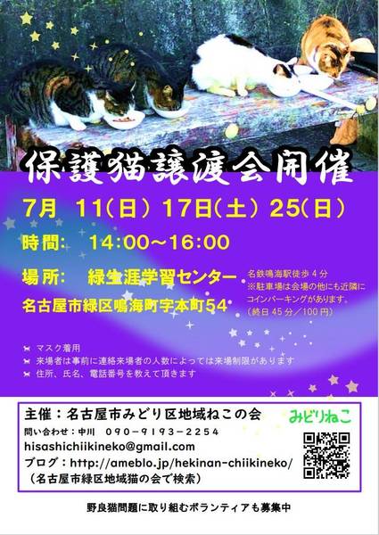 | イベント内容 | 名古屋市緑区生涯学習センターにて開催。お気軽にお越しください。 参加猫さん等詳細情報は 09091932254 中川までお問い合わせください。 |