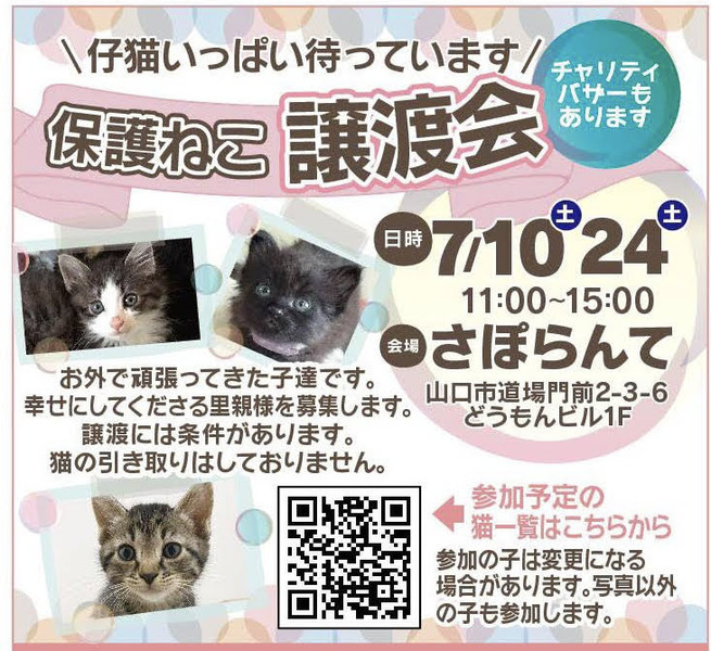 | イベント内容 | 春に産まれた仔猫ちゃんがたくさん参加予定です! 山口市の『さぽらんて』で「保護ねこ譲渡会inさぽらんて」(ボランティア合同開催)が開催されます。 時間は11時から15時まで。 猫ちゃん達は写真で見るより実際に見てもらった方が可愛いと思います。ぜひ足をお運びいただいて、運命の子との出会いを見つけてください。 *譲渡には条件がありますので、気になる子がいましたらお問い合わせください。 *参加予定ねこちゃんは当日変更になる場合があります。 *チャリティーバザーもあります。 *感染症予防対策は会場でも行っておりますが、各自でも宜しくお願い致します。 *画像はほっぷさん作成のものを使用させて頂いております。 *入場の際はマスク着用の上、検温や手指消毒にご協力お願い致します。 *新型コロナウイルス感染拡大状況によっては急きょ中止になる場合もあります。 |
