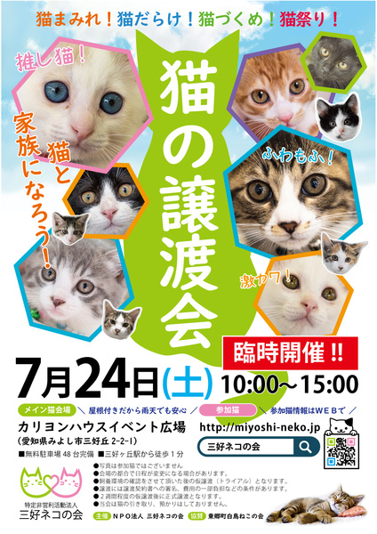 | イベント内容 | ★子猫祭り第4弾「猫のオリンピック」は土曜日に開催★ 今が一番カワイイ盛りの子猫26匹が大集合。 激カワもふもふ子猫祭り第4弾やっちゃいます! http://miyoshineko.sblo.jp/article/188852659.html *予約、譲渡会前のお見合いはできません。 ▼金メダルがみんな獲れますように。 7月24日(土)10時~15時 三好丘カリヨンハウスイベント広場 愛知県みよし市三好丘2-2-1 *入場時の検温と消毒、会場内でのマスク着用のご協力をお願いします。 *譲渡会前に個別お見合いはできません。 【来場前にご確認ください】 スタッフと来場者の安全のためにコロナ対策を強化します。 会場前で整理券をお渡し後、順番にご案内いたします。 入場をグループ制とさせていただき、各グループ10人程度、会場内の滞在時間を30分程度に制限します。 猫は早いもの勝ちではございません。 NPO法人三好ネコの会 http://miyoshi-neko.jp |