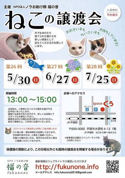 | イベント内容 | 仔猫がいっぱい参加して、新しいお家を求めて参加します(=^・^=) 猫は後日こちらからお届けをさせて頂き、お家の環境を見せて頂ければと思います。 猫は20年くらい生きる子もいますので、ご自身の年齢に合った猫さんとの出会いを探しに来てください。 ペット不可にお住まいの方はご遠慮ください! 仔猫の場合は、お留守番が長いお家には難しいですので、ご了承ください。 譲渡には条件が多数ありますので、ご理解くださいませ<m(__)m>。 予約制になっておりますので、里親希望の方は『 猫のミーナ 』のお問い合わせからご連絡をして、時間を決めて頂ければと思います。 お越しの際はJR芦屋駅からは徒歩3分、車でお越しの場合は近隣にコインパーキングがあります。 当日、体調の悪い方、発熱がある方、このような方はご遠慮ください。 こちらでは、体温チェックや消毒をし、万全を期しております。 |