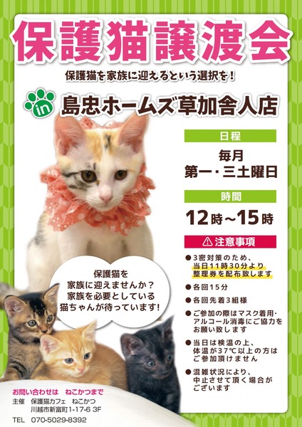 | イベント内容 | 8月7日(土)保護猫カフェ「ねこかつ」さん主催の譲渡会が開催されます。 子猫から中猫から成猫迄沢山の猫達が参加予定です。 新型コロナウィルス感染拡大防止のための「注意事項」があります。 日時 8/7(土)12:00〜15:00 会場 島忠ホームズ草加舎人店店(草加市遊馬町 2-1) ■最寄駅からの交通アクセス *日暮里・舎人ライナー「見沼代親水公園駅」より徒歩約10分 *東武伊勢崎線「草加駅」より東武バス(草加22系統)乗車 「島忠ホームズ」より徒歩すぐ ■車の場合 *ナビシステムによっては「41-1」で検索をすると正確 ■駐車場のご案内 *大型無料駐車場完備 主催 保護猫カフェねこかつ 子猫から中猫から成猫さんまでいろいろな世代の子達が沢山参加予定です。 ぜひ足をお運び下さい。 譲渡にはお願いごとがございます。譲渡条件をご確認下さい。 浦和キャッツ「http://urawacats.blog133.fc2.com/」をご覧下さい。 参加猫達は 浦和キャッツ http://urawacats.blog133.fc2.com/ または 翔べ!しっぽの猫たち https://ameblo.jp/shippocats-ganba2016/ をご覧下さい。 不幸な犬や猫が沢山います。 浦和キャッツは猫の保護活動をしていますが助けられる猫はほんの少し。 なんとか保護出来た子はみんな幸せへと送り出したいと強く思い活動しています。 猫と暮らしたいと思われましたらぜひ保護猫を家族に迎えて頂けます様に。 尚、天候などにより里親会が開催されない場合があります。 当日朝のブログにてお知らせしますので、予めご確認お願いします。 |