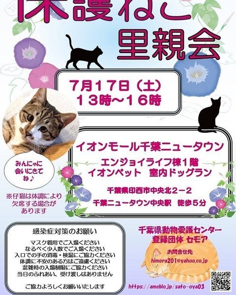| イベント内容 | ご予約は不要です。 感染症対策のため、入場人数を制限しての開催となります マスク着用、アルコール消毒液、検温にご協力お願い致します。 ★生後2ヶ月~3ヶ月までの子猫が約10頭参加の予定です。 ~~参加ねこ~~ https://ameblo.jp/sato-oya03 ★お問い合わせはhimera201@yahoo.co.jpまで |