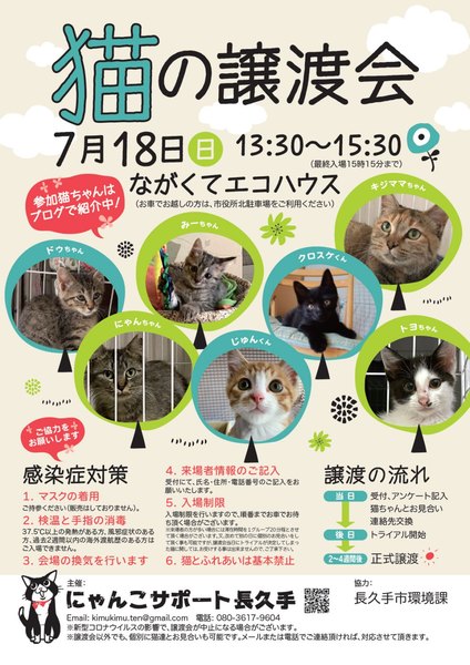| イベント内容 | にゃんこサポート長久手主催 猫の譲渡会 7月18日(日) 13:30~15:30(最終入場15:15まで) ながくてエコハウス(長久手清掃センター) 長久手市岩作宮前99番地(お車でお越しの方は、市役所北駐車場をご利用ください) 参加猫はブログにて紹介いたします https://ameblo.jp/nyankonagakute/ 感染症対策として 1.マスクの着用(ご持参ください。販売はしておりません。) 2.検温と手指の消毒(37.5℃以上の発熱がある方、風邪症状のある方、過去2週間以内の海外渡航歴のある方はご入場できません) 3.会場の換気を行います。 4.来場者情報のご記入(受付にて、氏名・住所・電話番号のご記入をお願いいたします。) 5.入場制限(入場制限を行いますので、順番までお車でお待ちいただく場合がございます。) *来場者が多い場合には滞在時間を1グループ20分ほどとさせていただく場合がございます。また、改めて別の日に個別のお見合いをして頂くことも可能ですが、譲渡会当日にトライアルが決定してしまった際に関しては、お受けする事は出来ませんので、ご了承ください。 6.猫とふれあいは基本禁止 譲渡会の流れ 当日 受付、アンケート記入、猫ちゃんとお見合い、連絡先交換 後日 トライアル開始 2~4週間後 正式譲渡 *新型コロナウイルスの影響で、譲渡会が中止になる場合がございます。 *譲渡会以外でも、個別に猫たちとお見合いも可能です。メールまたはお電話にてご連絡頂ければ、対応させて頂きます。(チラシに電話番号、メールアドレス記載) にゃんこサポート長久手 協力:長久手市環境課 |