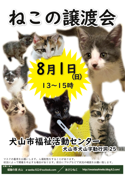 | イベント内容 | 【ココがポイント!】 ★健康診断、ウイルスチェック済み! 20匹ほど参加予定です。 【日時】 8月1日 (日) 13時~15時 【場所】 犬山市福祉活動センター (犬山市大字犬山字勧行洞25) 予約不要 駐車場あり 【ブログでチェックどうぞ】 あさひねこ http://owariasahineko.blog.fc2.com/ 福猫の里 犬山「福猫の里便り」 https://hukunekonosato.hatenablog.com/ 問い合わせ先(福猫の里 犬山) a-saoka.922@outlook.com ーーーーーーーーーーーー 【感染予防対策】 ★入口で手の消毒あり ★マスクの着用をお願いします ★入場制限する場合があります ★猫と猫の間をあけます。 ★保護主との距離も取ります ★定期的に換気をします 【お約束】 当日、会場での猫の引き渡しはしておりません。 後日ご自宅までお届けします。 お試し飼育(トライアル)を1週間ほどして頂き、双方が納得の上で正式譲渡となります。 譲渡の際は、医療費の一部の負担をお願いしております。 (ワクチン代 等) ・ペット可のお住まい ・完全室内飼育、終生飼育 ・適切な医療措置 ・不妊手術の実施と報告 等、お約束があります。 ☆可愛い猫達が暖かい家族を待っています☆ ☆ぜひお越し下さい☆ |