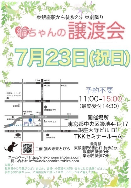 | イベント内容 | 東銀座で保護猫の譲渡会を開催しています「猫の未来とびら」です♪ 恵まれない環境にいる猫たちが未来へのとびらを開いて幸せなご縁に繋がる橋渡しをしていきます。 たくさんの猫ちゃんと保護主・スタッフ一同みなさまのご来場を心よりお待ちしています! 子猫ちゃん〜成猫ちゃんまで参加します♪ ※ご来場頂く方と私たち保護主、スタッフの安心と安全の為、感染リスクを限りなく低減させる為、私たちが出来うる対策をしてお待ちしております※ 【ご来場いただく皆様には下記についてお願い致します】 ★マスクの着用をお願い致します。 (マスク着用のない方は入場出来ません) ★譲渡会場にお入り頂く前に検温・手洗いと手の消毒、検温をお願い致します。 ★ソーシャル・ディスタンス(人と人との間隔を開ける)をお願い致します。 ★熱のある方や体調の優れない方は譲渡会への来場を見合わせて頂けますよう、お願い致します。 ★来場者数によりましては人数制限もありますので長時間お待たせてする場合もございます。 予めご了承下さい。 コロナウイルス感染拡大防止の為、厳しいお願いで大変恐縮ですが何卒ご理解とご協力、ご了承をいただけますようお願い致します。 ★☆★★☆★★☆★★☆★★☆★★☆★★☆★★☆★★☆★ ★開催日時 2021年7月23日(祝日) 11:00~15:00 (最終受付 14:30) ★11時00分より整理券を配布致します。 ★会場 東京都中央区築地4-1-17 銀座大野ビル B1 TKKセミナールームさんにて (東劇となり) ★最寄駅 東銀座駅 6番出口 徒歩2分 銀座駅 徒歩9分 ・築地駅 徒歩7分 駐車場は当ビルの駐車場または近隣のコインパーキング等をご利用ください。 会場への直接のお問い合わせはご遠慮くださいませ。 ★☆★★☆★★☆★★☆★★☆★★☆★★☆★★☆★★☆★ 会場で猫ちゃんと触れ合ってご縁を繋いでください。 里親様・猫ちゃんが双方、幸せな家族になれるよう保護主・スタッフがサポート致します。 ご不安な事はお気軽にご相談ください。 入場無料です。事前のご予約は不要です。 当日猫ちゃんの引き渡しはございません。 後日、保護主が里親様宅へお届けいたします。 ※参加予定猫ちゃんは、急な体調不良等で不参加になる場合もございます。 開催当日の朝、当会ブログにて不参加の最新情報を掲載致しますのでご確認をお願い申し上げます。 ◇譲渡に関してのお願い・基本条件 1.家族の一員として終生最期まで愛育下さい。 2.完全室内飼い・ペット可のお住まい 3.脱走防止対策 4.避妊・去勢手術 5.里親様のご自宅へのお届け 6.譲渡誓約書への署名捺印・身分証明書の提示 7.医療費譲渡金のご負担 8.定期報告 9.トライアル期間有り ※保護主により譲渡条件は異なりますので会場で直接ご相談ください。 60才以上の方のみのご家庭、未成年の方、単身の方、同棲中の方、 小学生低学年以下のお子様のいる方、必要な脱走対策を施していただけない方は譲渡が出来かねますのでご了承ください。 仔猫の場合は主にお世話される方のご年齢は55歳までとさせて頂きます。 オーバーする方はご相談くださいませ。 小さな子猫の譲渡は体重が1kgになってからのお届けやお留守番の無い(少ない)ご家庭を希望いたします。 動物も病気になったり、年老いた場合には介護が必要になる場合がございますので、その時にきちんと必要な医療費を捻出出来る、経済力がある里親さまへの譲渡となります。 医療費譲渡金に関しましては詳しくはホームページの 【譲渡に関してのお願い】【譲渡の流れ】をご覧くださいませ。 ~主催 猫の未来とびら~ |