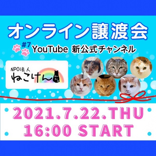 | イベント内容 | ねこけん★YouTube LIVE譲渡会! YouTube『NPO法人ねこけん新公式チャンネル』より配信 https://www.youtube.com/channel/UCkQMHfWUQc-KldxomKcINEA ★チャンネル登録大歓迎!ぜひ、よろしくお願いします★ シェルターや預かりさん宅よりリアルタイムで猫さんをご紹介♪ 譲渡会では緊張で固まってしまう子も多いですが、 普段通りの可愛い様子が見られちゃう!?かも?! ライブ配信中は猫さんへのご質問にも対応させていただきます。 たくさんのご参加お待ちしております! ライブ配信を見逃してしまってもアーカイブ投稿されますので、 いつでも視聴可能です♪ 今後も土日祝日に開催したいと計画中です。 決定次第お知らせしますので、ぜひチャンネル登録お願いします。 -------------------- ↓↓過去配信YouTubeLIVE譲渡会アーカイブはこちら↓↓ https://youtube.com/playlist?list=PLGxWcXWzmM4So7TE8_FdaeNUOPzQA1wju -------------------- ペットとしてではなく、生涯家族として猫を迎えて下さる方への譲渡となります。 原則『譲渡会』もしくは『完全予約制個別お見合い』にて正式なお申込みを承っております。 譲渡会には家族を待っている猫さん達がたくさん参加します♪ ▽▲ねこけん定期譲渡会▲▽ ★毎月第4日曜日 12:00〜16:00 島忠ホームズ仙川店 〒182-0003 東京都調布市若葉町2-1-7 https://www.shimachu.co.jp/gmshop/tokyo/313.html ※当日11:30より整理券を配布。(各回15分、各回先着3組様) ◆必ずお守り頂く事◆ ①終生飼養 ②完全室内飼養 ③年1回のご報告 ④ペット飼育可能な物件にお住まいであること ただし、以下の該当の方は、譲渡出来ない場合がございます。 ※学生、安定的な収入のない方 ※60歳以上の方は、成猫さんを家族に迎え入れることが出来ます。 里親様のご年齢に応じた成猫の譲渡となりますのでご相談ください。 不妊去勢手術・医療費の一部負担をお願いしております。 ※お届けエリアによっては掲載の譲渡費用とは別途、往復高速料金(実費)をご負担いただく場合がございます。 ご希望の猫さんと家族になるまでの流れや、譲渡時にかかる一部ご負担金などの詳細、契約書のサンプルも含め下記URL①②に掲載しております。ご確認ください。 ①譲渡をご希望の方へ https://nekoken.jp/jotokai/joutokibou/ ②ねこさんと家族になるまでの流れ http://nekoken.jp/jotokai/joto-nagare/ なお、譲渡対象エリアは東京近郊(東京都・神奈川県・埼玉県・千葉県)に限らせていただきます。 対象エリア内であっても、遠方の場合アフターフォローの関係上お断りさせていただく場合もございますのでご了承ください。 ※譲渡会日程がご予定と合わず個別お見合いご希望の方は、各募集サイトからのご応募もしくは下記連絡先までお問い合わせください。 —————————— [連絡先] ご質問等ございましたらお気軽にお問い合わせください。 NPO法人ねこけん東京本部 https://nekoken.jp/inquiry/ nekoken@cat.email.ne.jp [ホームページ] http://nekoken.jp [Instagram] https://www.instagram.com/nekoken2222/ [ブログ・ボラ日記・YouTubeなど] https://linktr.ee/nekoken フォロー・チャンネル登録よろしくお願いします! |