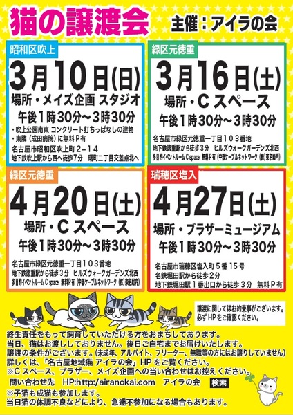 | イベント内容 | 4/27(土) 場所 ブラザーミュージアム 会議室 住所 名古屋市瑞穂区塩入町5-15 開催時間 13:30~5:30まで 無料P有り ☆名鉄堀田駅から徒歩2分、地下鉄堀田駅1番出口から徒歩3分 予約不要ですが、 ご来場前に必ず譲渡の約束事を「踊るココちゃんブログ」でご確認ください。 http://airanokai.blog.fc2.com/ 参加猫もこちらのブログに準備で来次第掲載してゆきます。 主催:名古屋地域ネコ アイラの会 http://airanokai.com/ ※当日ご都合が悪い場合、別途お見合いも致します。 問い合わせ先 airanokai$gmail.com $を@に変えて送ってください。 http://airanokai.com/ でご覧ください。 当日ネコをお渡しすることはしていません。 飼育環境を見届けさせていただくため、後日ご自宅までお届けします。 譲渡誓約書を取り交わします。詳細はHPをご覧ください。 なお、お一人暮らしの高齢者の方は、身内の方の保証を必要とします。 ペット不可物件にお住まいの方、学生、フリーター、同棲カップル、無職の方への譲渡はお断りしています。 予めご了承ください。 ☆譲渡会では、アンケートのご記入をお願いしています。 アンケート内容をもとにお話をすすめさせていただきます。 猫を迎えることに関し、ご家族の了解を得ており、家族の一員として責任を 持って迎えていただける方にのみ譲渡させていただきます。 |