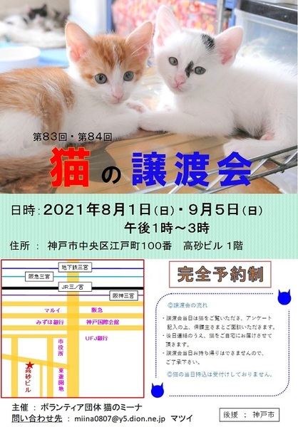 | イベント内容 | 仔猫も大人猫さんも参加して、みんな新しい家族との出会いを求めて参加します。 猫と一緒に幸せになりたい方、出会いを探しに来られませんか。 コロナ渦、万全の態勢で運営しておりますので、来られる際にはマスクの着用をしてください。 また体調のすぐれない場合は無理をせず、次回の参加でお願いします。 こちらでは参加を希望の方には、ご予約をして貰っておりますので、必ず予約を取ってからお越しください。 予約は、『猫のミーナ』のホームページのお問い合わせにご連絡をください。 ペット不可にお住まいの方は、ご遠慮ください。 猫は後日こちらからお届けをさせて頂き、ご自宅の環境と脱走防止の状態を見せて頂ければと思います。 猫は20年くらい生きる子もいますので、ご自身の年齢に合った猫さんとの出会いを探しに来てくださいネ。 譲渡には条件がありますので、ご理解ください。 会場には、三宮の各駅から徒歩10分ほどです。 車でお越しの方は、近隣にはパーキングがあります。 |