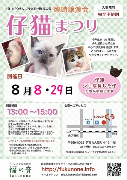 | イベント内容 | 仔猫がいっぱい参加して、新しいお家を求めて参加します(=^・^=) 猫は後日こちらからお届けをさせて頂き、お家の環境を見せて頂ければと思います。 猫は20年くらい生きる子もいますので、ご自身の年齢に合った猫さんとの出会いを探しに来てください。 ペット不可にお住まいの方はご遠慮ください! 仔猫の場合は、お留守番が長いお家には難しいですので、ご了承ください。 譲渡には条件が多数ありますので、ご理解くださいませ<m(__)m>。 予約制になっておりますので、里親希望の方は『 猫のミーナ 』のお問い合わせからご連絡をして、時間を決めて頂ければと思います。 お越しの際はJR芦屋駅からは徒歩3分、車でお越しの場合は近隣にコインパーキングがあります。 当日、体調の悪い方、発熱がある方、このような方はご遠慮ください。 こちらでは、体温チェックや消毒をし、万全を期しております。 |