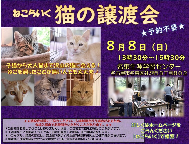 | イベント内容 | 子猫とおとな猫が参加します 実際に猫をみて触ることができます 保護主にそれぞれの猫の特長などをお気軽に質問ください どの猫がご自分の生活に合うのかじっくりと 決めていただきたいです もちろん、ぴッときた猫でも! 日にち:2021年8月8日(日) 時間 :13時30分~15時30分 会場 :名東生涯学習センター 名古屋市名東区社が丘3-802 *駐車場有(300円/日) 満車の場合は猪高緑地公園駐車場(無料)も ご利用になれます 生涯学習センターの受け付けに案内用地図が用意されています 主催:ねこらいくnenet https://nekonetwork.com/ 募集猫中の猫は https://nekolike.amebaownd.com/ *子猫参加します 上記ブログで紹介しています 子猫の急な体調変化により参加できない場合もあります 実際に猫を見てから考えたい 飼育の仕方について質問したい・・・など すぐに決められない方でも結構です ぜひ、譲渡会におこしください 〇室内飼い、家族全員の同意、治療費の負担など お願いごとがあります 〇1~2週間のお試し飼育期間があります 〇当日、猫を連れて帰ることはできません *感染症対策を実施しています ・会場入出時の手の消毒、検温にご協力ください ・常時、窓を開け換気をしています ・スタッフはマスクを着用し、ご入場の方にもマスクの着用を お願いしています ・室内への入場は一定の人数とさせていただきます |