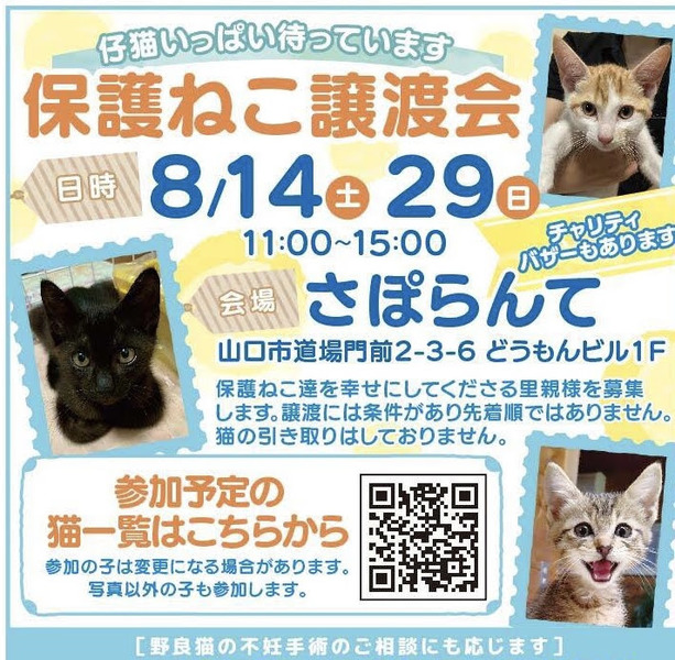 | イベント内容 | 春から夏に産まれた仔猫ちゃんがたくさん参加予定です! 山口市の『さぽらんて』で「保護ねこ譲渡会inさぽらんて」(ボランティア合同開催)が開催されます。 時間は11時から15時まで。 猫ちゃん達は写真で見るより実際に見てもらった方が可愛いと思います。ぜひ足をお運びいただいて、運命の子との出会いを見つけてください。 *譲渡には条件がありますので、気になる子がいましたらお問い合わせください。 *参加予定ねこちゃんは当日変更になる場合があります。 *チャリティーバザーもあります。 *感染症予防対策は会場でも行っておりますが、各自でも宜しくお願い致します。 *画像はほっぷさん作成のものを使用させて頂いております。 *入場の際はマスク着用の上、検温や手指消毒にご協力お願い致します。 *新型コロナウイルス感染拡大状況によっては急きょ中止になる場合もあります。 |