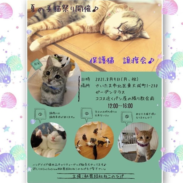 | イベント内容 | 秘密結社ねこのひげ・保護猫譲渡会を 8/9(月・祝)12:00~16:00に さいたま市北区東大成町1-230 ガーデンテラス内で開催します♪ こんなご時世での開催になりますが じゃぶじゃぶ溢れる子猫達に ずっとのおうちを。。 保護を待つ子猫達に保護の枠を。。 どちらも待った無し… の思いで開催します。 なので今回の譲渡会に際しては 移動の感染リスクを避けるため ご近所さんの里親さまご希望の方を メインに考えております。 そんなに混まず ゆっくりと未来の家族と対面できるかと♪ 万が一、混んだ時は入場制限や 整理券の配布を行います。 受付名簿のご記入、検温、消毒 マスク着用などのご協力をお願い致します。 物販の方も屋外スペースにて こじんまり置かせて頂きますので ご近所の方はふらりと是非 お立ち寄りくださいませ♪ ご不明な点がございましたら インスタグラム#秘密結社ねこのひげ の DMまでお問い合わせ下さい。 |