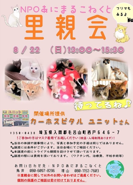 | イベント内容 | 子猫から成猫まで、たくさん参加します! フリーマーケットも行います♪ なお、犬の団体さんの参加もあるかもしれませんが、今回あにまるこねくとからは犬の参加はありませんので、猫だけになる可能性もあるのでご了承ください。 |