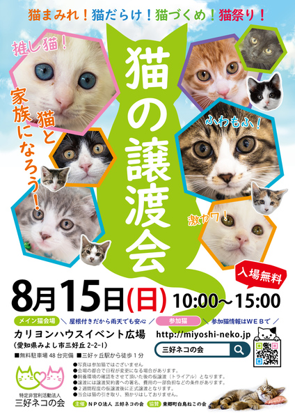 | イベント内容 | ちっちゃなちっちゃな猫の譲渡会(=^・^=) 年少さんがたくさんいます!家族候補を探しに来ませんか? エアコン完備の抱っこ部屋で好きなだけ抱っこできます。 *子猫は発育、健康状態がそれぞれ違います。 譲渡会に不参加になる場合があります。 <納涼子猫まつり> 8月15日(日)10時~15時 三好ヶ丘駅前カリヨンハウスイベント広場(エアコン完備で涼しい!!) 愛知県みよし市三好丘2-2-1 ●譲渡が決まると猫トイレ、トイレ砂5L×2袋をもれなく進呈。 1匹につき1セットご提供、複数の場合は頭数分をご提供します。 さらにアンケートに答えるとLION商品豪華詰め合わせが必ずもらえます! http://miyoshineko.sblo.jp/article/188311208.html 【来場前にご確認ください】 スタッフと来場者の安全のためにコロナ対策を強化します。 会場前で整理券をお渡し後、順番にご案内いたします。 入場をグループ制とさせていただき、各グループ10人程度、会場内の滞在時間を30分程度に制限します。 猫は早いもの勝ちではございません。 主催:NPO法人三好ネコの会 http://miyoshi-neko.jp |