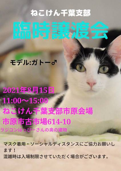 | イベント内容 | 8月8日は台風の影響で中止となりました。 楽しみにされていた皆様、申し訳ございません。 8月15日に臨時の譲渡会を開催することとなりました!! 通常スタイルの譲渡会と致しますが、コロナウイルス対策として ・会場内ではマスクのご着用と入退室の際は消毒をお願い致します。 ・ご予約無しでお越しいただけますが、混雑時は整理券を配らせていただきます。 ご協力の程よろしくお願い致します。 成猫は指名制のお見合いとさせていただく子もおりますので、 『◯◯ちゃんと、お見合い希望』とご指名の事前申し込みをお願い致します。 ねこけん千葉支部のブログ内にありますお問い合わせフォームより、 ⚫︎お名前 ⚫︎ご住所(市区町村までで大丈夫です) ⚫︎お見合いご指名猫の名前を、お知らせください。 ※締め切りは譲渡会前日8月14日(土)18時までとなっております。 ねこけん千葉支部ブログ→ https://ameblo.jp/nekoken-chiba/ また、譲渡会会場では、千葉県内にお住いの預かりボランティアさん及びお世話ボランティアさんを募集しています。 ご希望の方は、大変お手数をおかけしますが、譲渡会までお越しください。 ※ご都合がつかない場合は、お問い合わせ先までご相談ください。 [日時] 8月15日(日)11:00~15:00 [会場] 千葉県市原市古市場614-10 ※屋内での開催となり雨天決行です。 ※抱っこもOK! ※猫ちゃんの負担も考え、ご来場は時間内にお願い致します。 ※特にご予約などは必要ございませんのでご家族皆様でぜひお越し下さい。 ※駐車場あり。 [交通] 交通機関を利用してお越しの方 JR内房線 浜野駅より徒歩13分 浜野駅は、東京駅から京葉線→内房線でおよそ50分の距離!! お車でお越しの方 京葉道路蘇我インターより車で10分 ※駐車場はラジコンショップハッピー様裏手にございます駐車場をご利用ください [譲渡ご希望の方へのお願い] 誠に恐れ入りますが下記に当てはまります方への譲渡は不可となりますので予めご了承下さい。 ①学生さん、未成年の方、安定収入のない方 ②ペットを飼う事を許されていない住宅にお住まいの方 ③身体的、精神的疾病で治療中の方 ※60歳以上の方は別途条件がございますのでご相談下さい。 [譲渡の流れ] お申込み→審査→後日お届け→トライアル→正式譲渡 ※当日のお連れ帰りは出来ませんので予めご了承ください。 ※仮譲渡時にご希望の猫ちゃんにかかった医療費(血液検査・ワクチン・駆虫・不妊去勢手術等)をご負担願います。 しかし、正式譲渡に至らなかった場合は医療費を全額返済致します。 [主催] 動物愛護団体 NPO法人ねこけん 千葉支部 [ブログ] https://ameblo.jp/nekoken-chiba/ [参加動物] 成猫・子猫(ねこけん保護猫以外の猫ちゃんも参加予定です) [お問い合わせ] ご不明な点、ご質問等ございましたら下記までお問い合わせください。 chiba.info@nekoken.jp |
